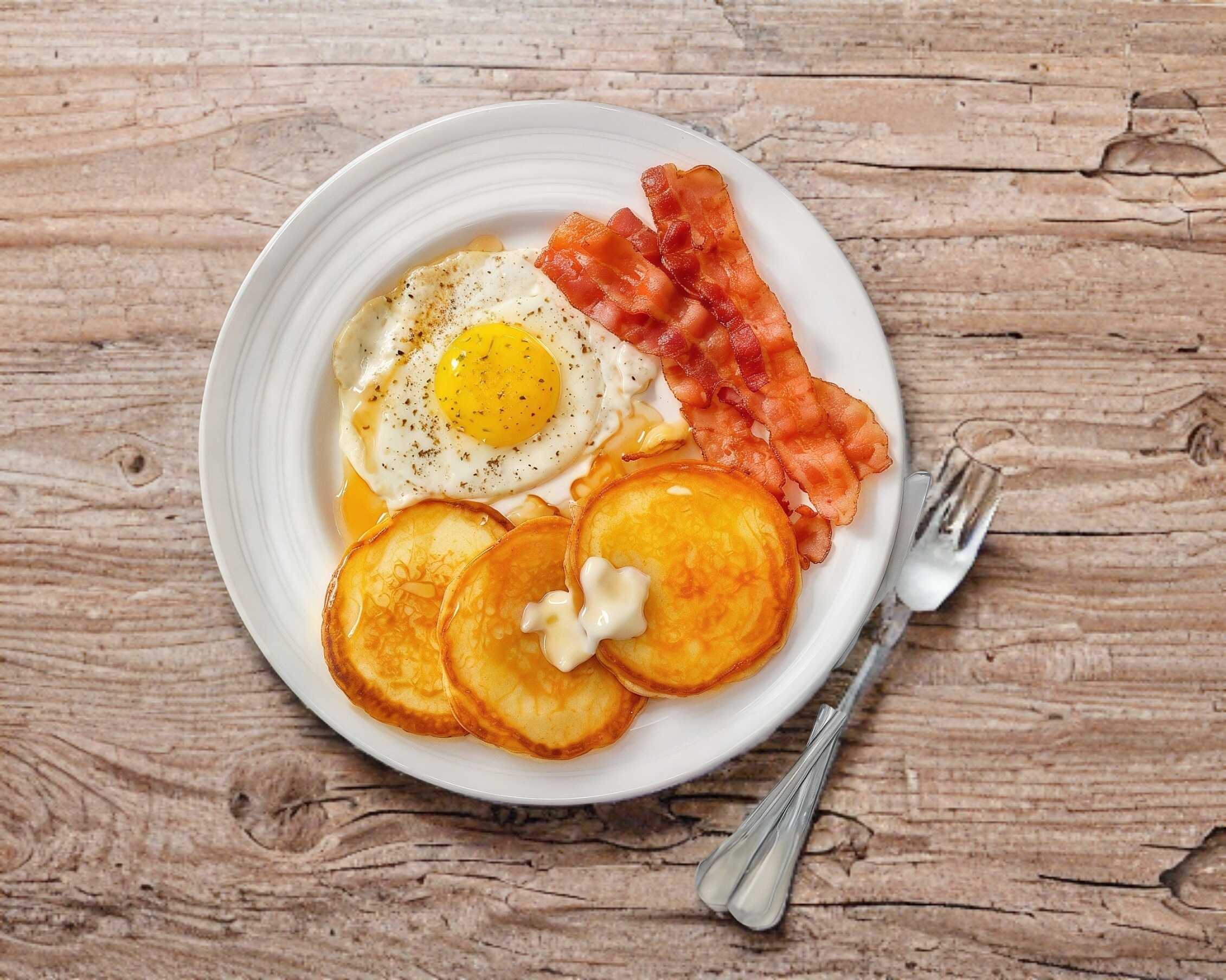 2 huevos al gusto (revuelto o estrellado) 2pz de tocino y 2 pz de panckes