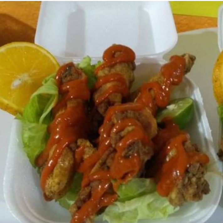 Deliciosa orden de alitas crujientes bañadas en salsa de tamarindo, tú eliges si la deseas picosa o no, acompañadas con lechuga, naranja y limón.