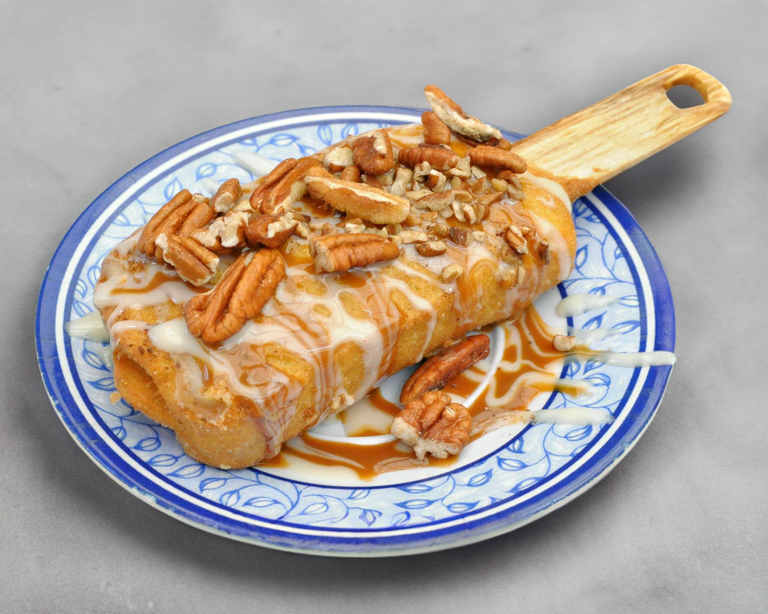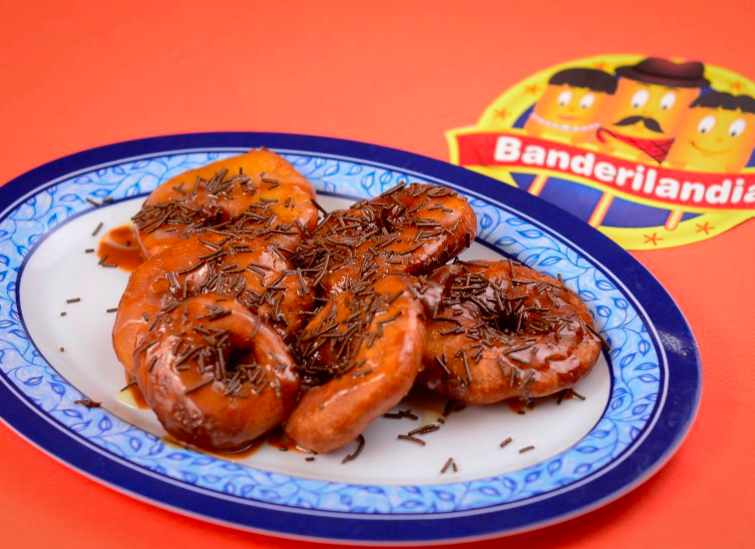 Queso fundido en nuestra masa especial acompañado de lechera, cajeta y elige entre granillo de chocolate nuez