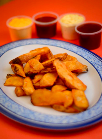 Carne, tocino, queso manchego, piña y salsa red hot picosita. Acompañada de papas a la Francesa