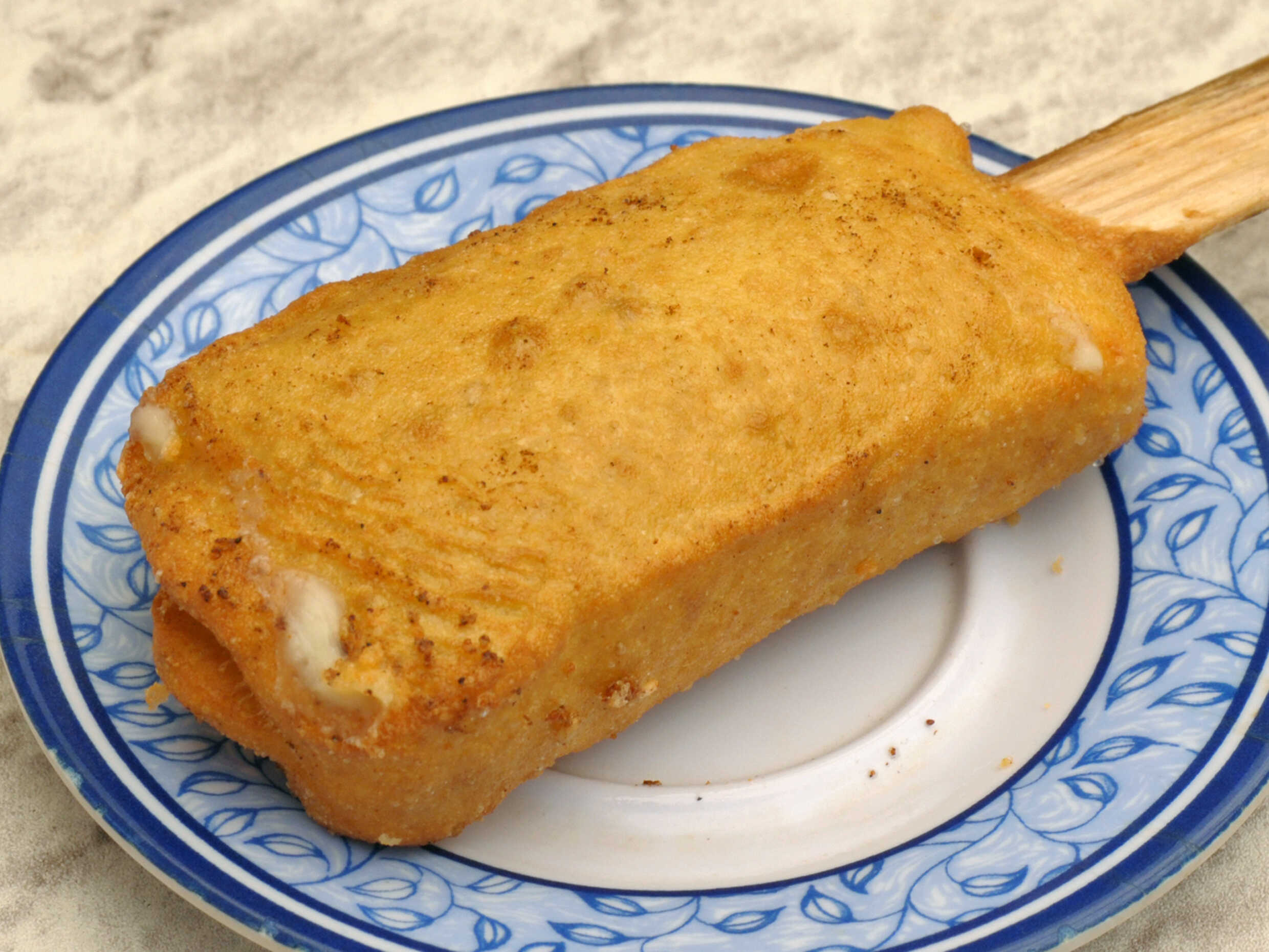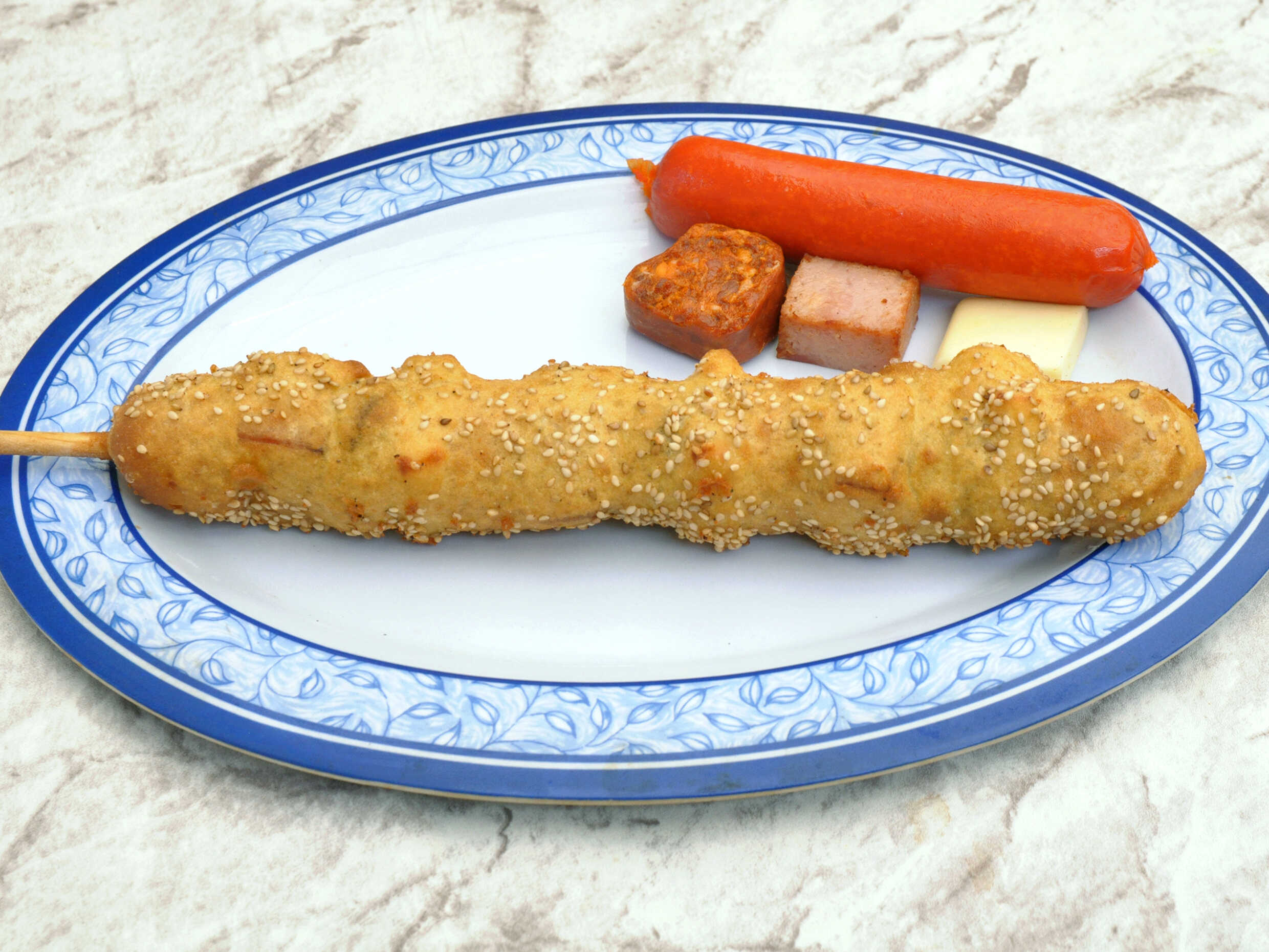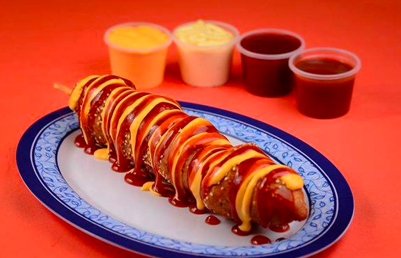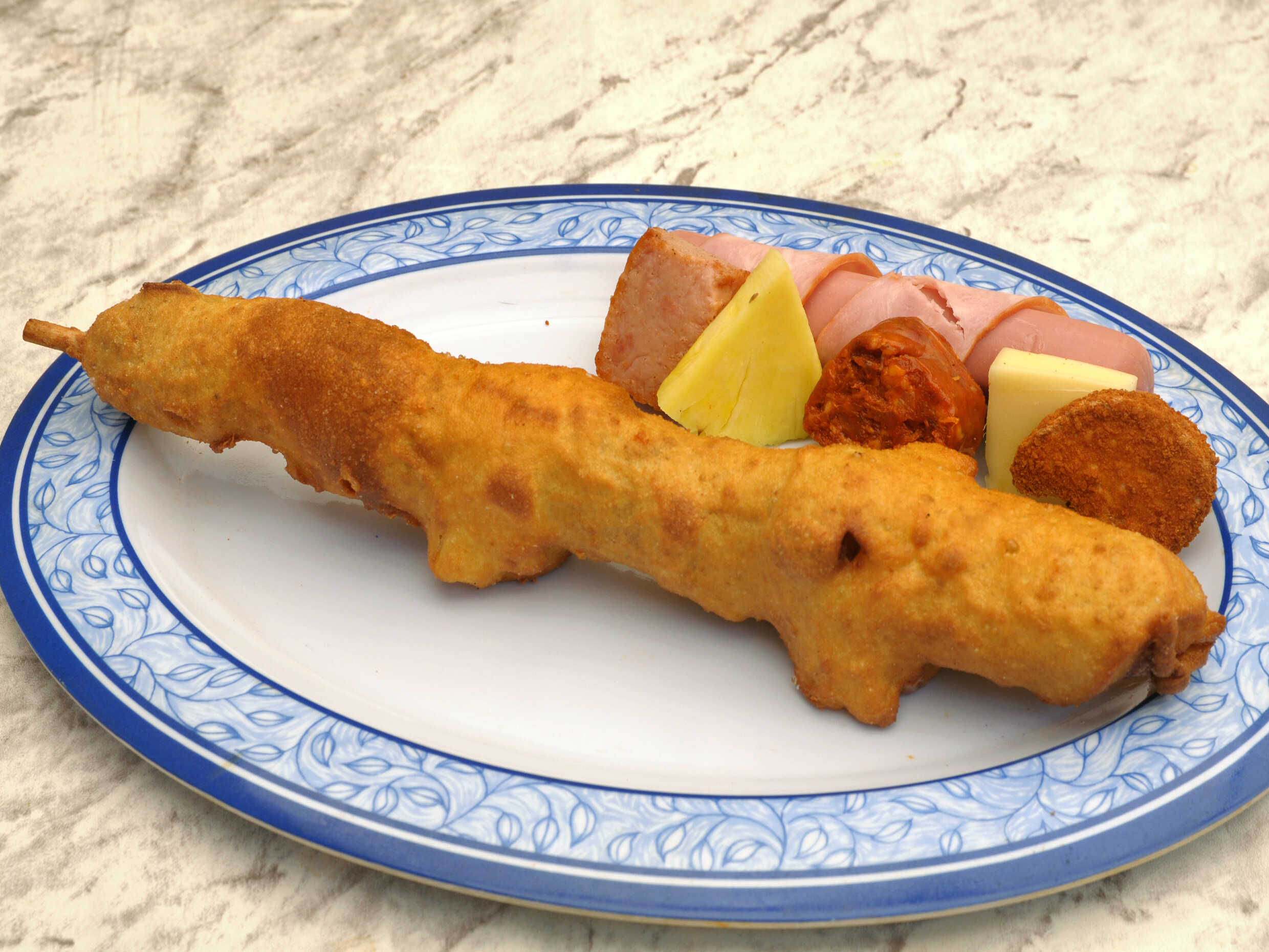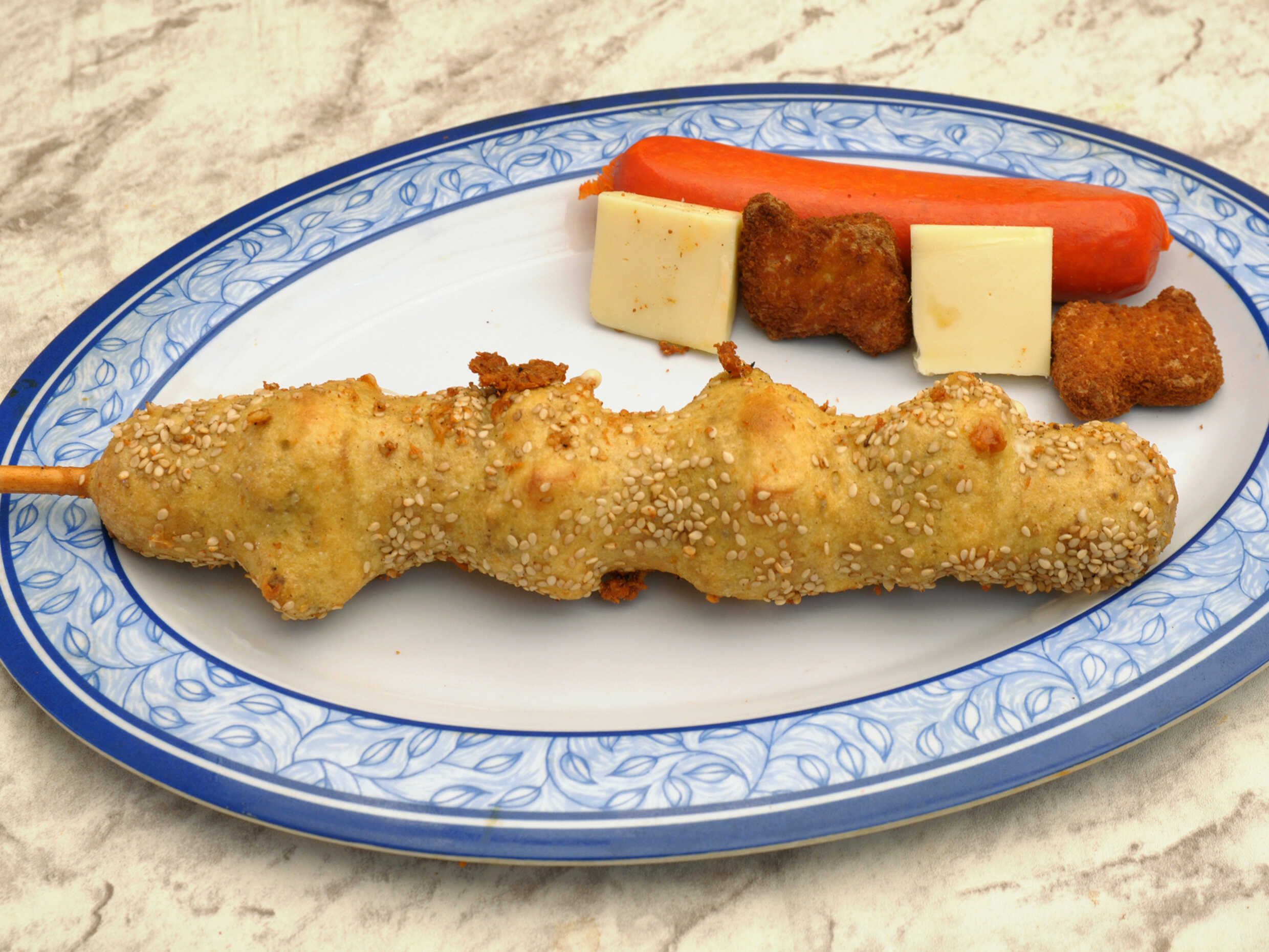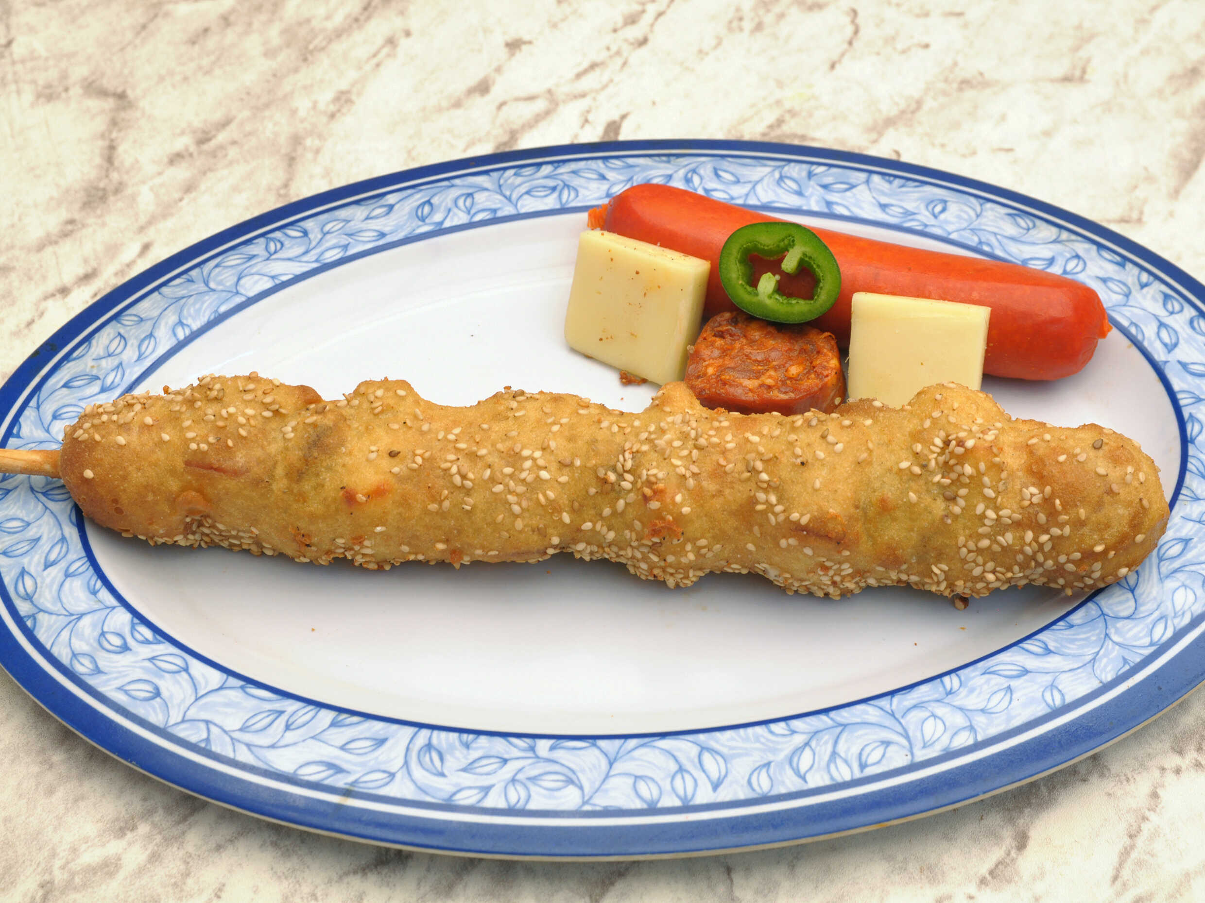 Banderillas Coreana con queso Manchego espolvoreada y frita con Panko, queso Amarillo y elige tu Topping favorito