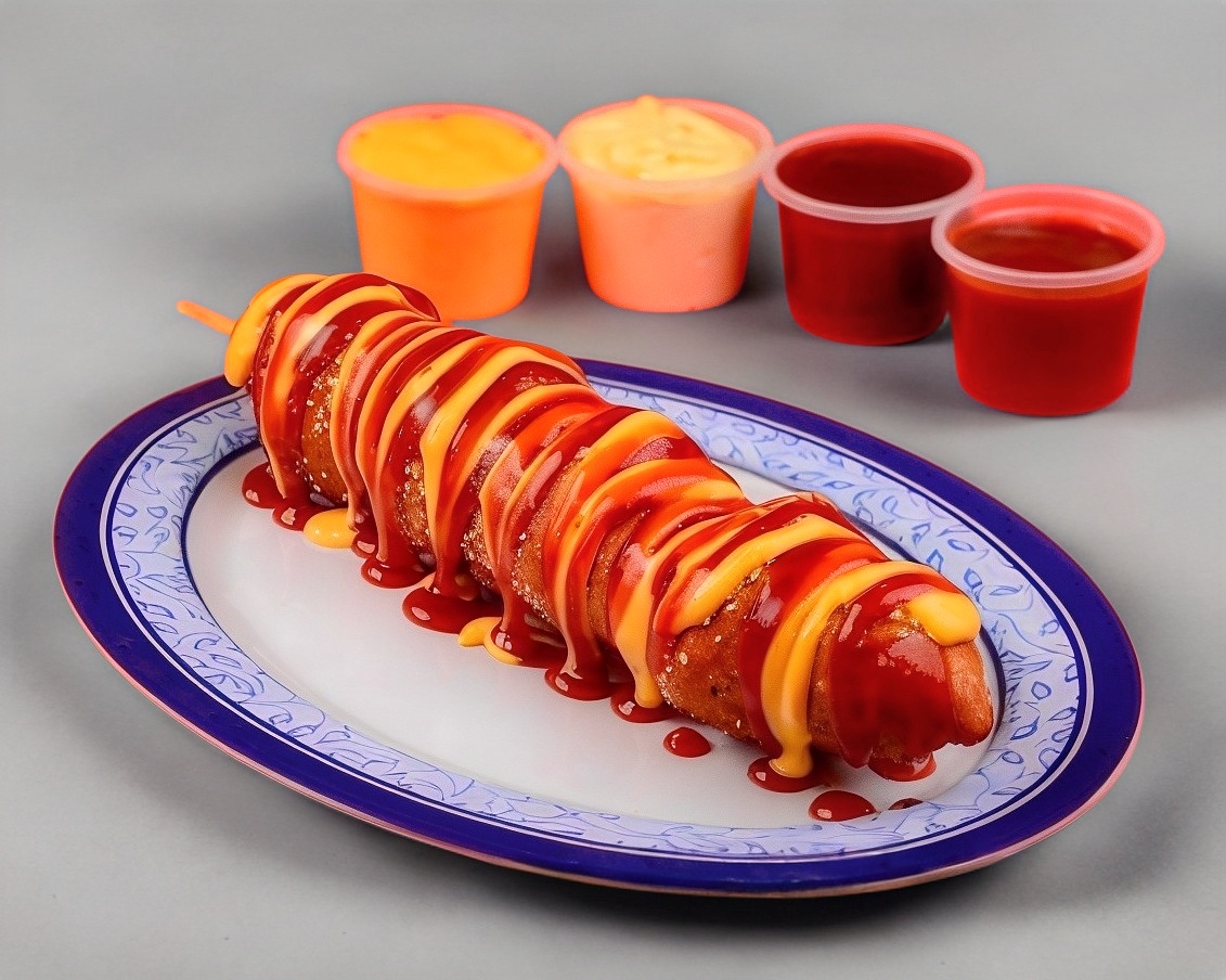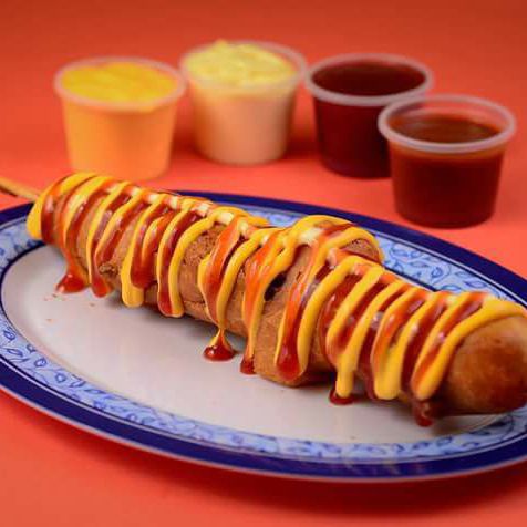 Banderilla de Salchicha y Queso Manchego, espolvoreada frita con Panko acompañada con queso amarillo y tú Topping favorito