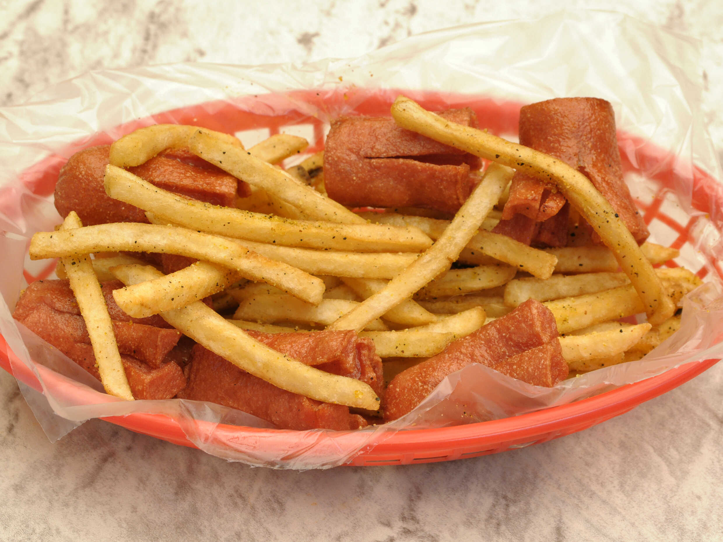 Nuestras papas 🥔 a la francesa sazonadas y acompañadas de salchichas fritas, llegaron para quedarse.