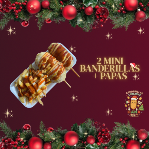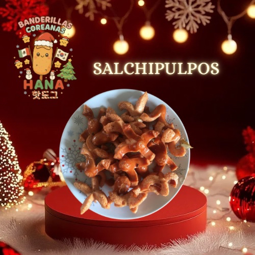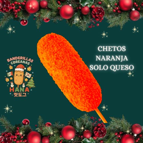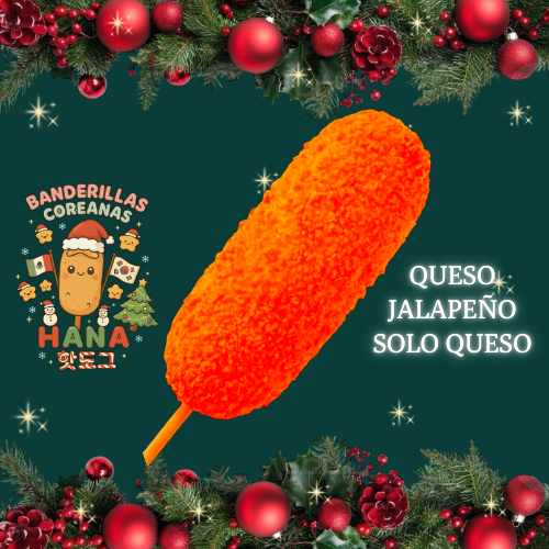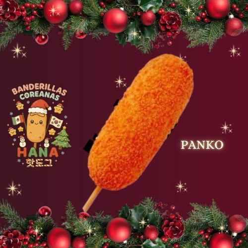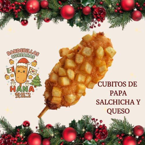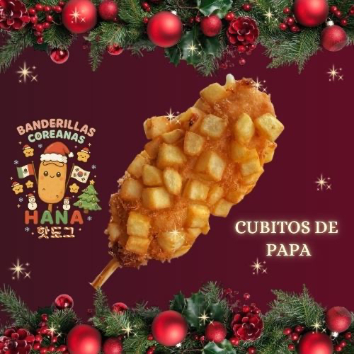 Banderilla cubierta de Panko con cubitos de papa solo salchicha con catsup queso mayonesa y salsa Valentina (todo aparte)