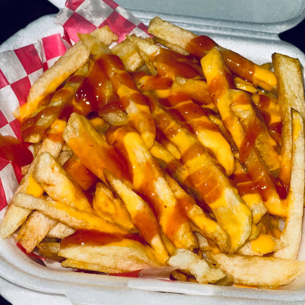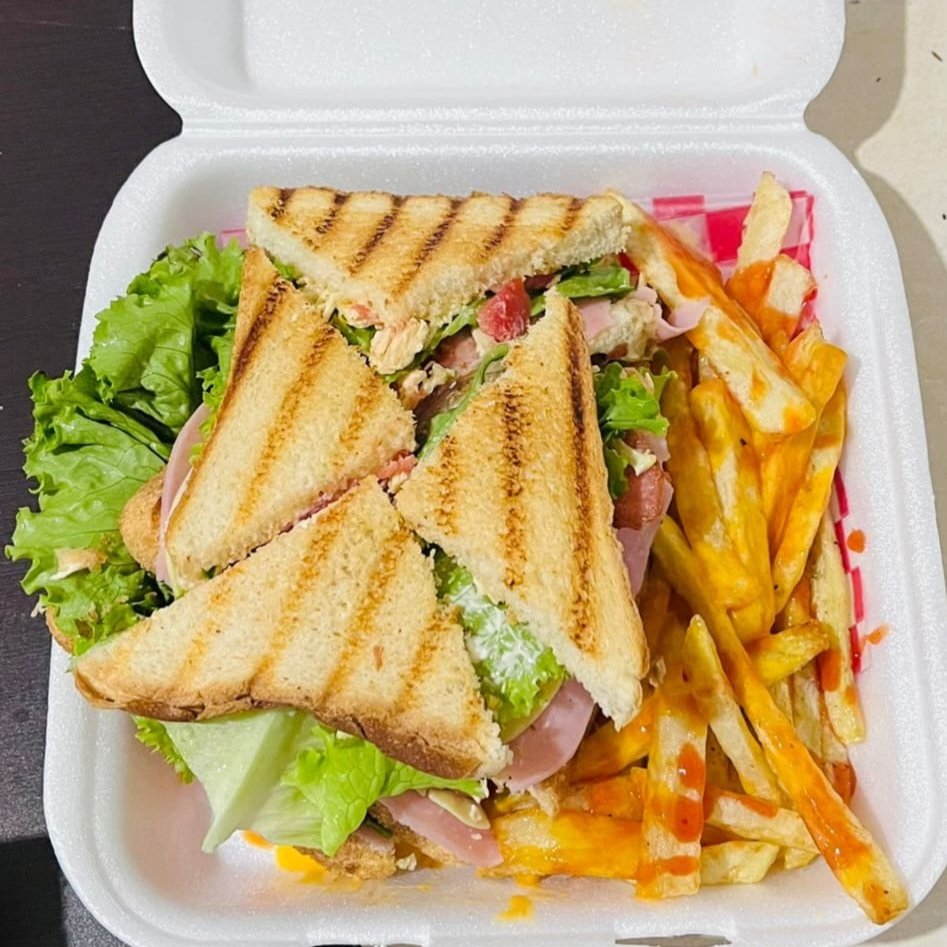 Sándwich acompañado de papas fritas con Pollo ,Jamón de pavo ,Tocino ,Queso manchego , Lechuga ,Jitomate ,Chiles jalapeños
