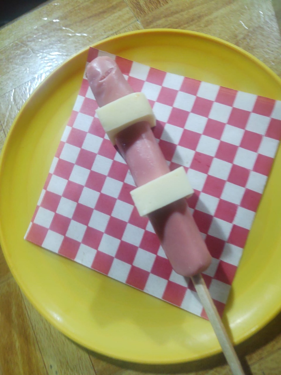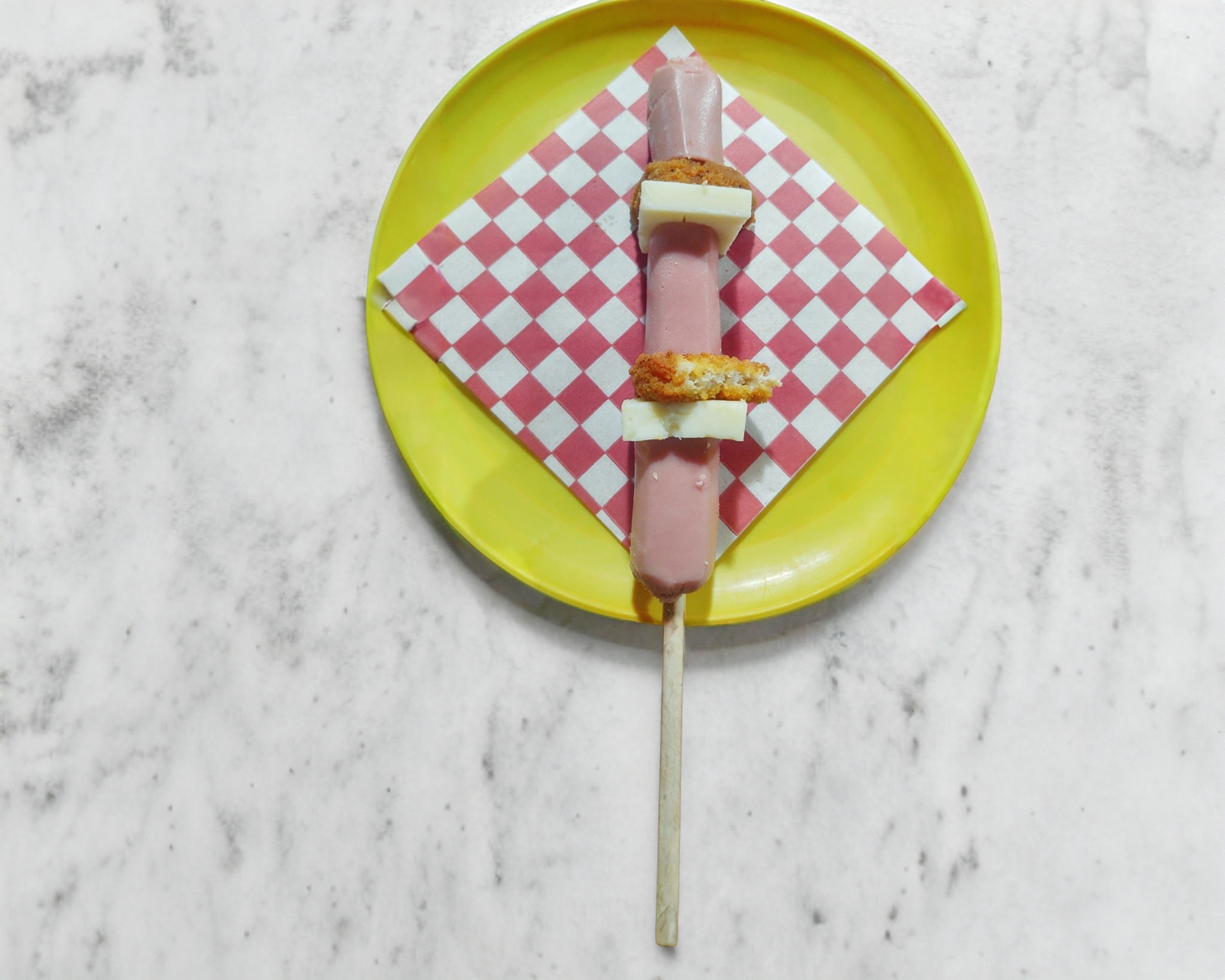 Salchicha, queso y nugget de pollo.