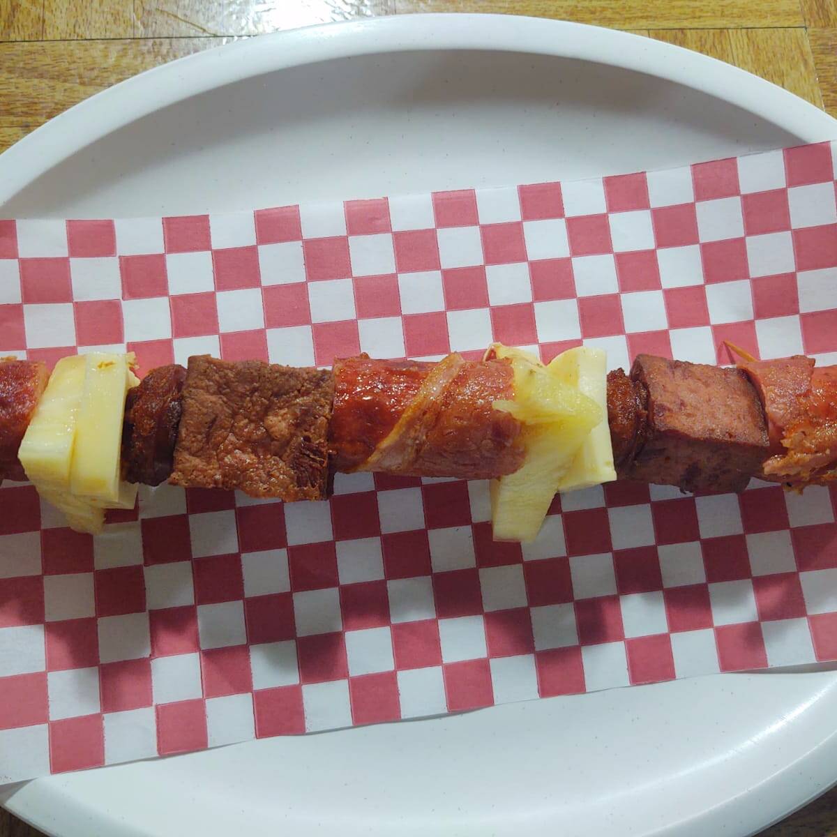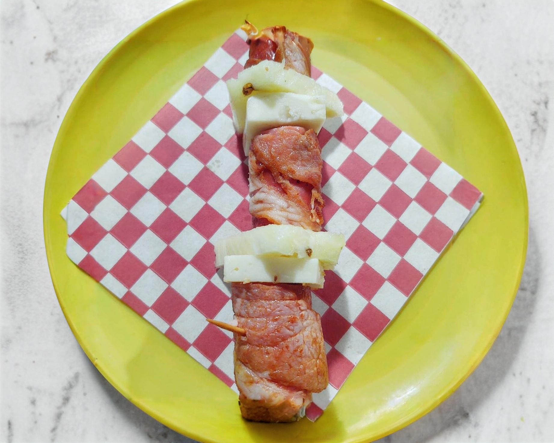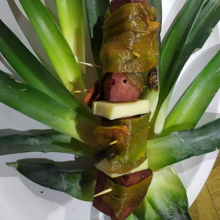 Salchicha jumbo, tocino, queso y piña.