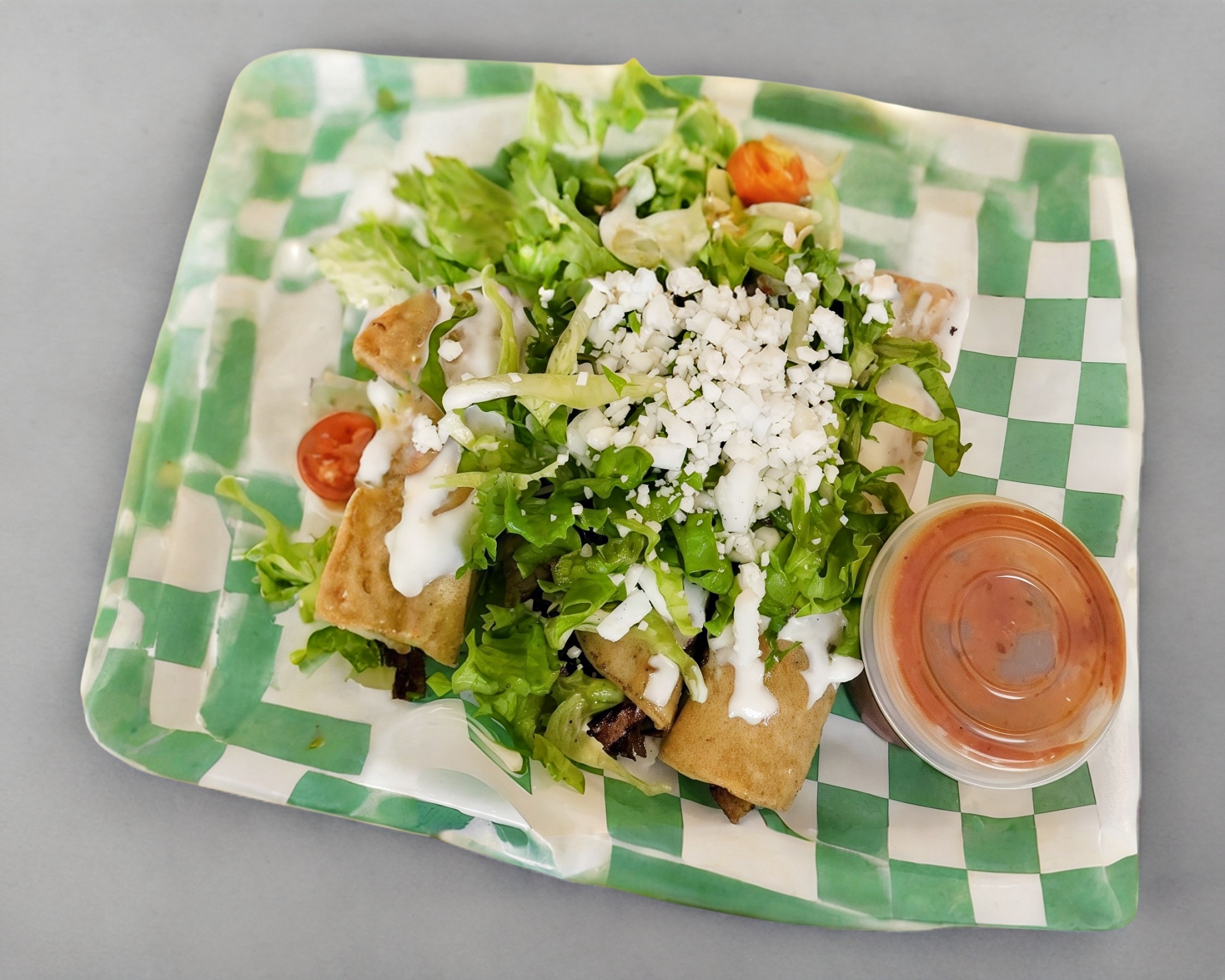 Orden de 3 flautas largas, hechas de tortilla de maíz enrollada y frita, rellenas de barbacoa con queso, crema y lechuga,