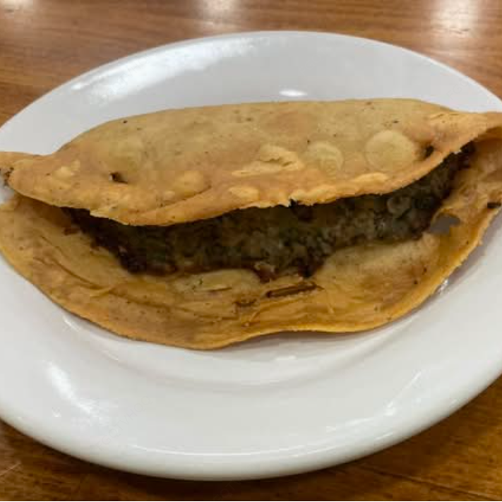 1 pza, Taco ligeramente frito bañado en crema y queso.