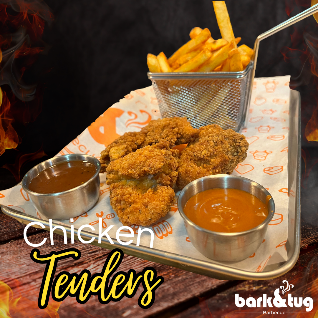 Pollo crujiente, jugoso por dentro y dorado por fuera. Acompañados de papas a la francesa y 2 aderezos para dipear