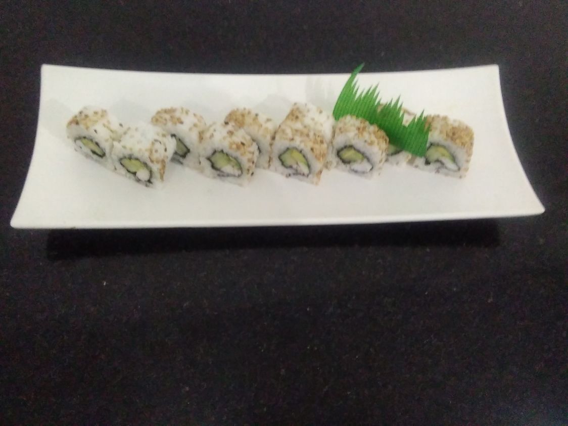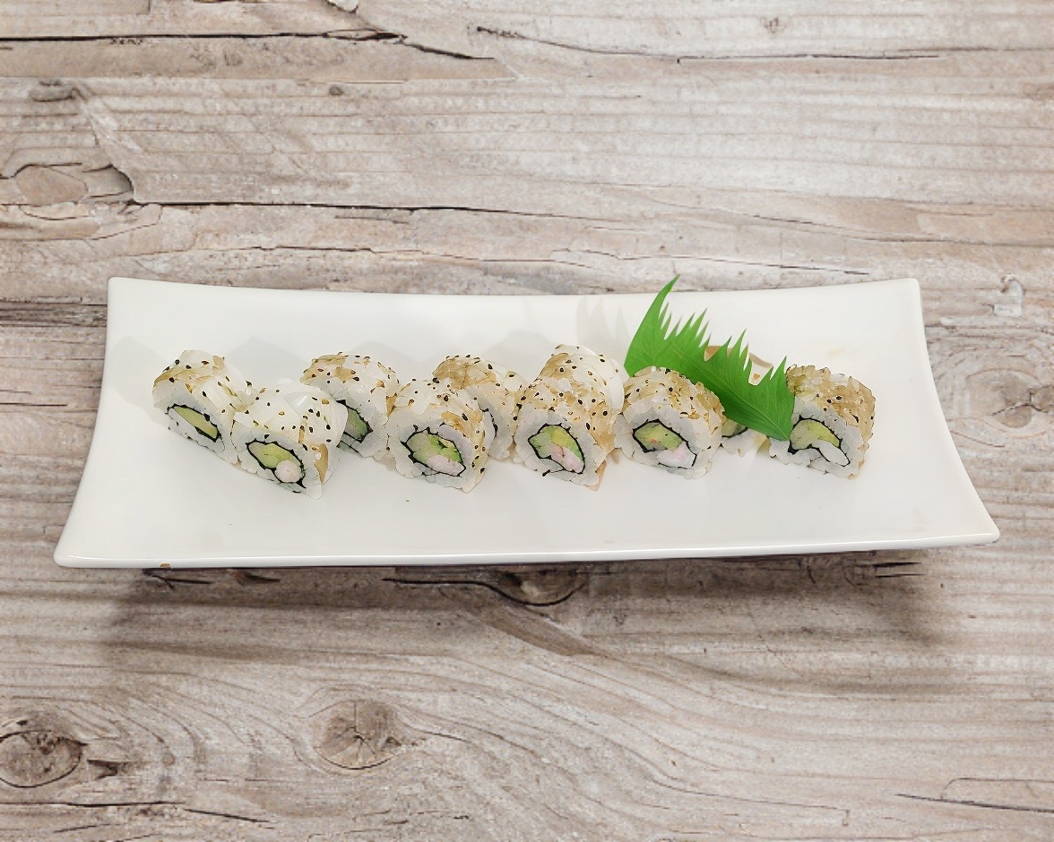 Tiras de cangrejo aguacate por dentro, queso crema, camarón, tampico, ajonjoli