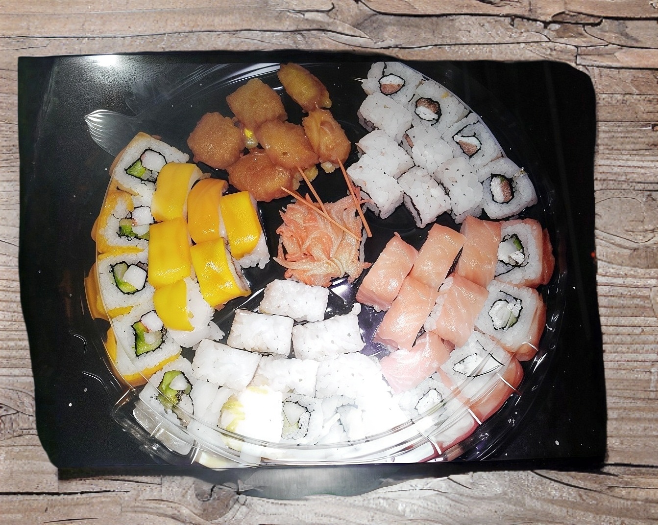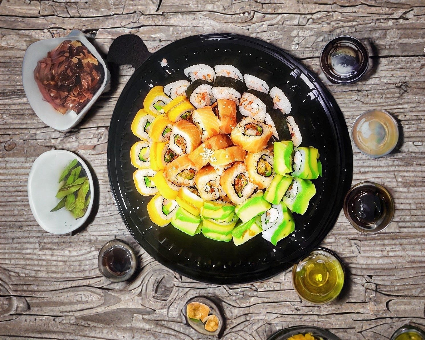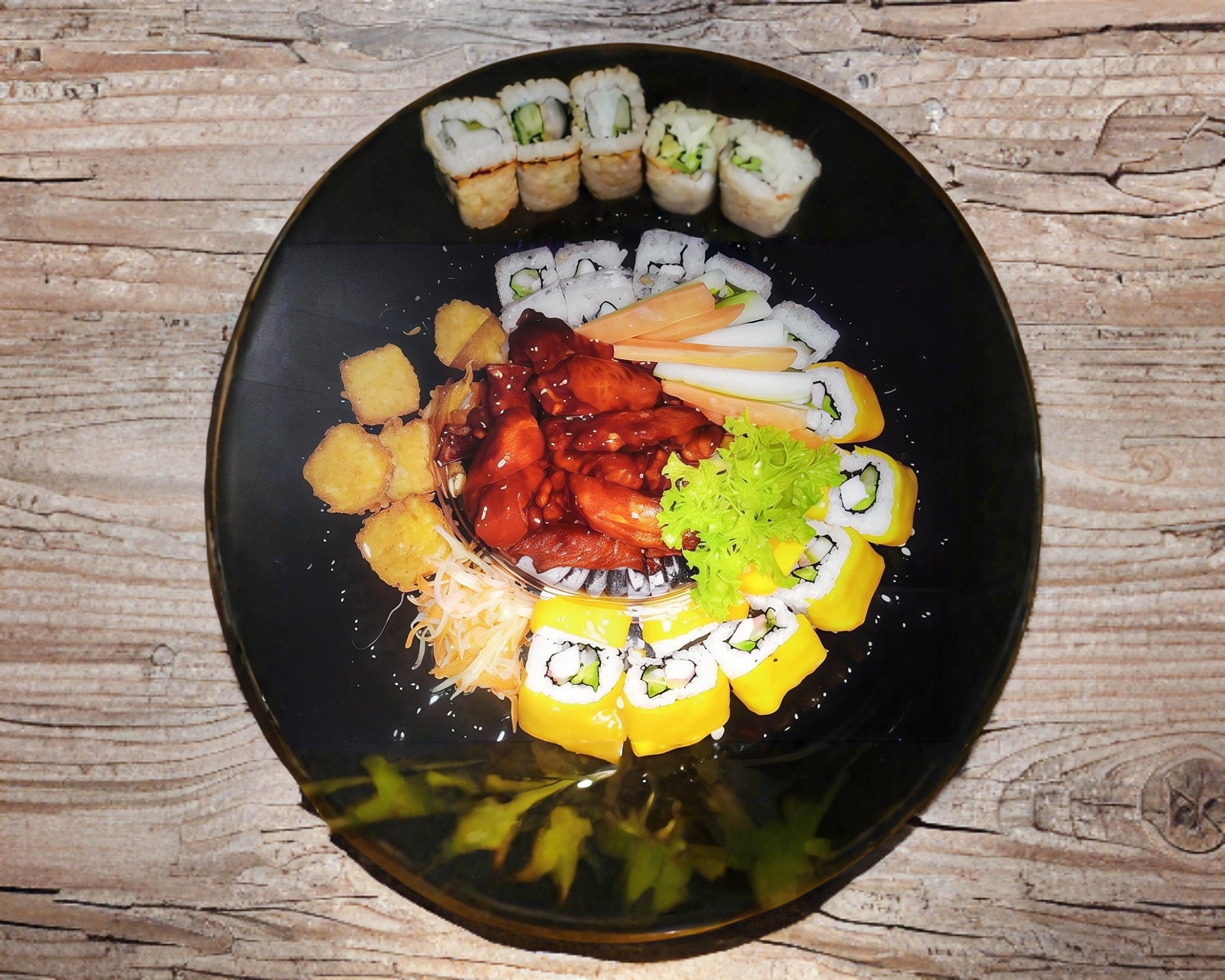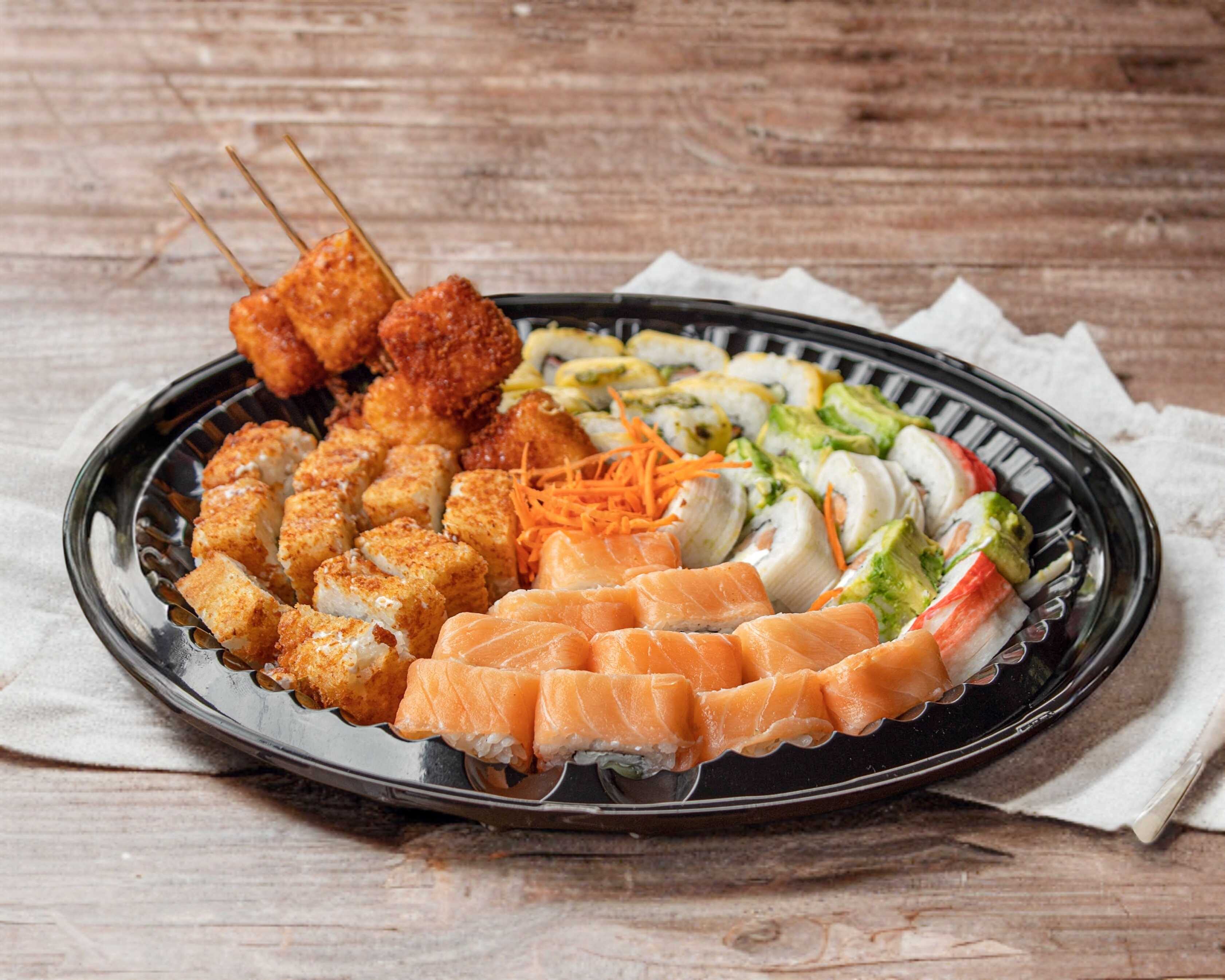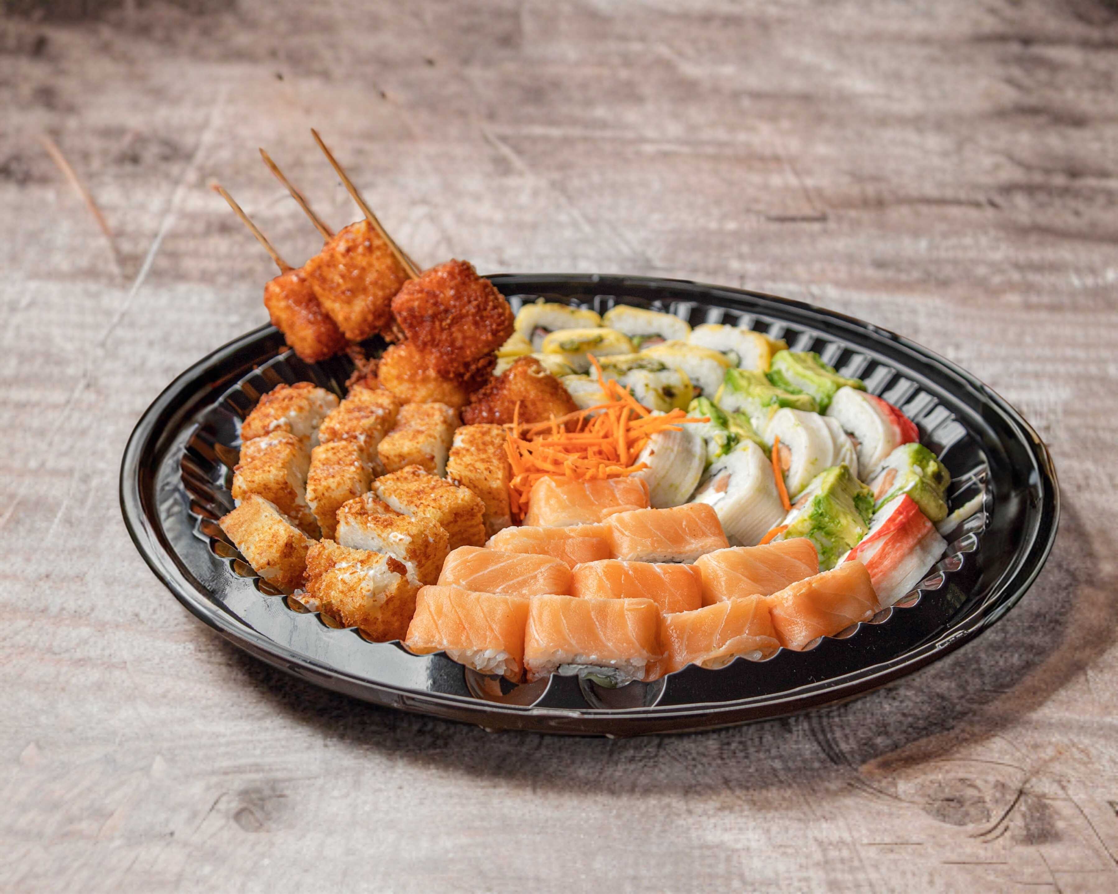 Cheese maki empanizado, samurai maki, manchego roll, mango roll, camarones barrio, edamame (asado ó al vapor) y 2 yakitori de pollo.