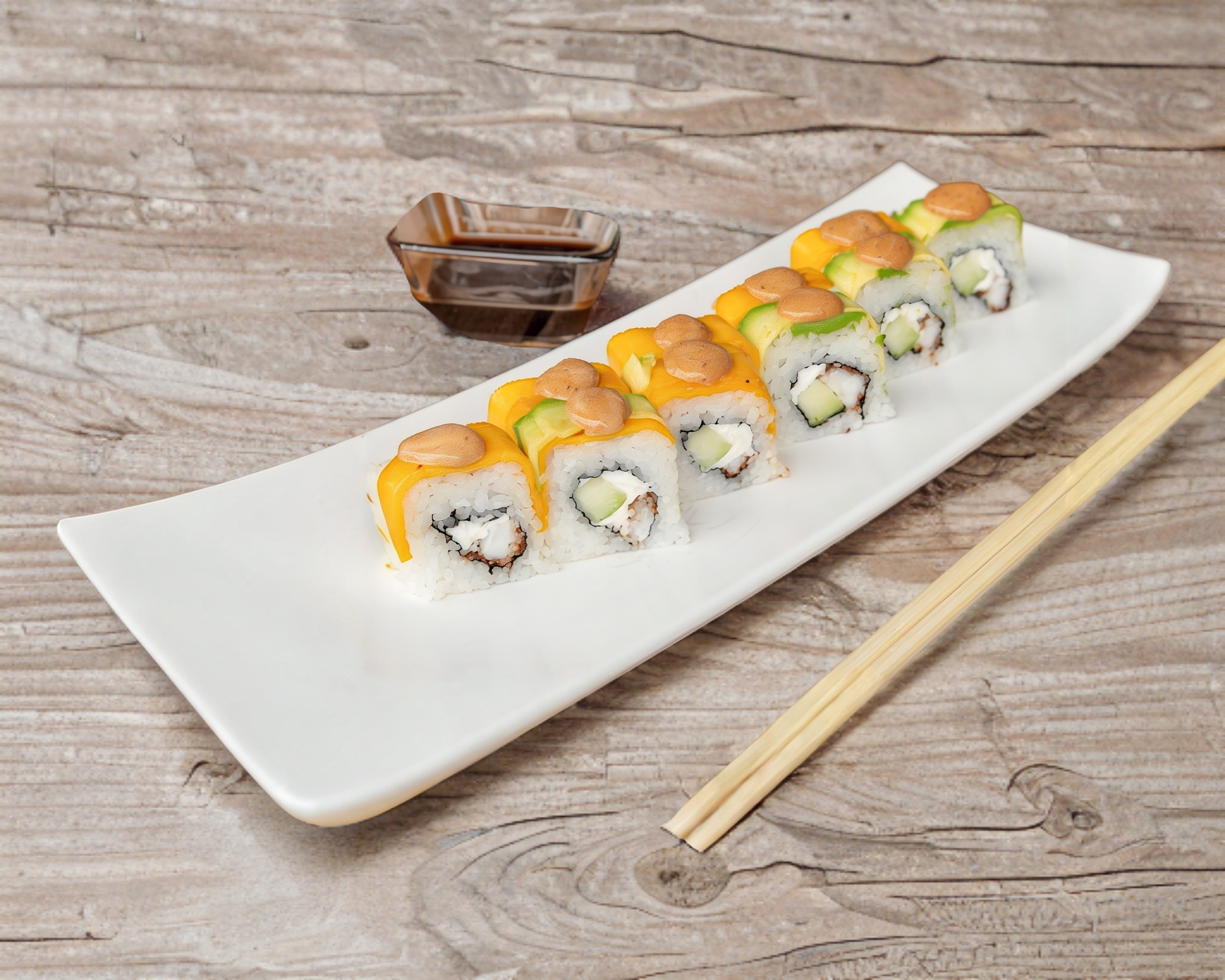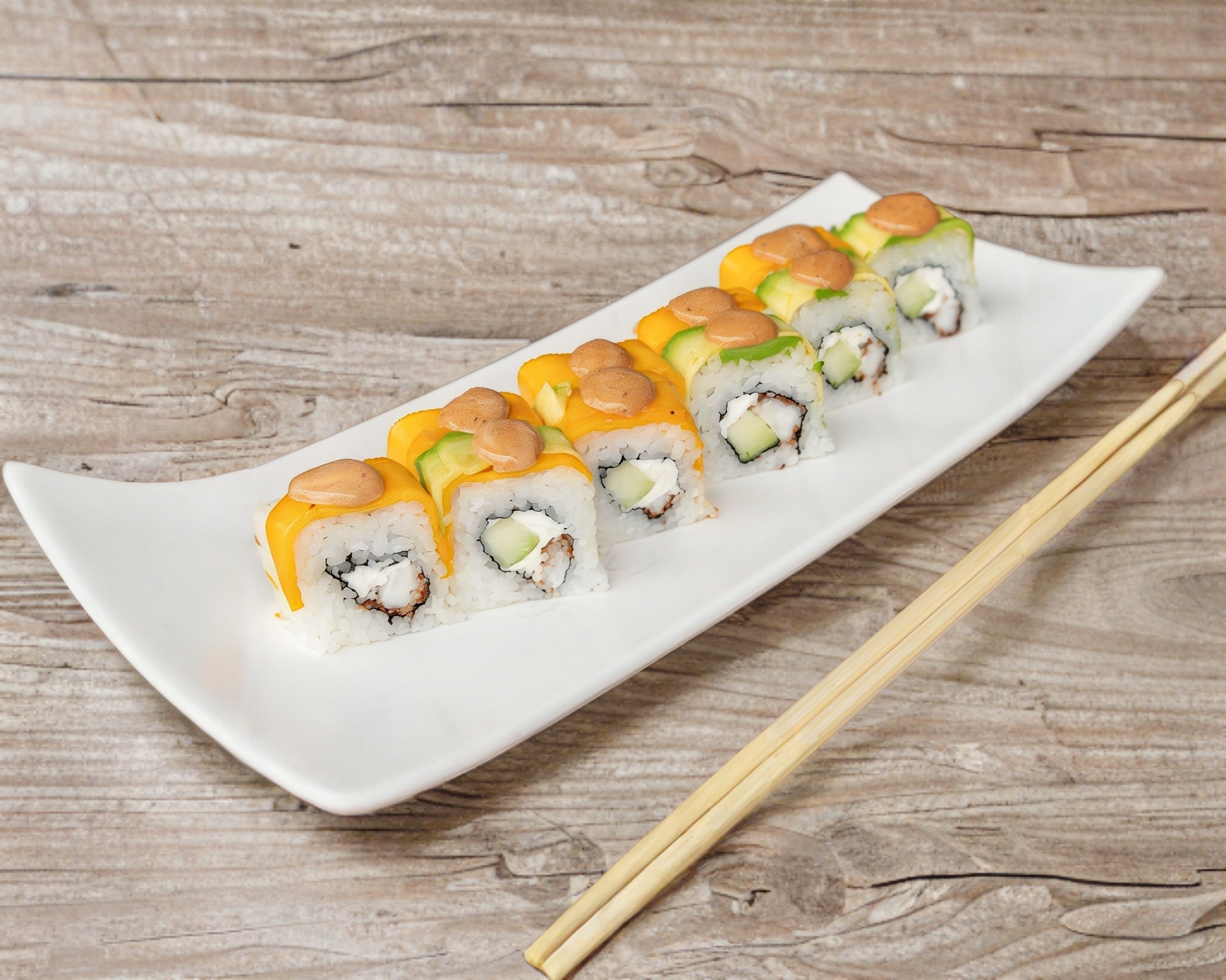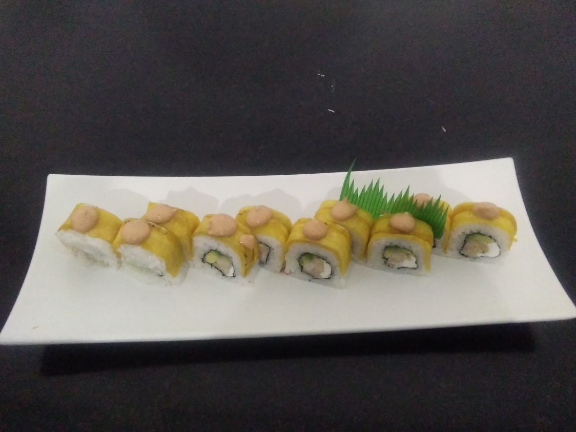 Mango, aguacate, queso crema, pepino, camaron empanizado , salsa dulce y salsa de chipotle