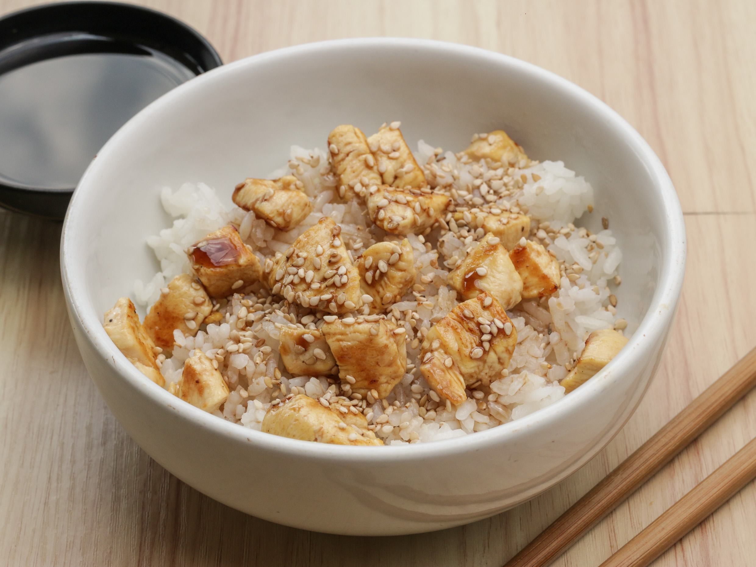 Arroz blanco con pollo al teriyaki y bañado con salsa teriyaki y ajonjolí