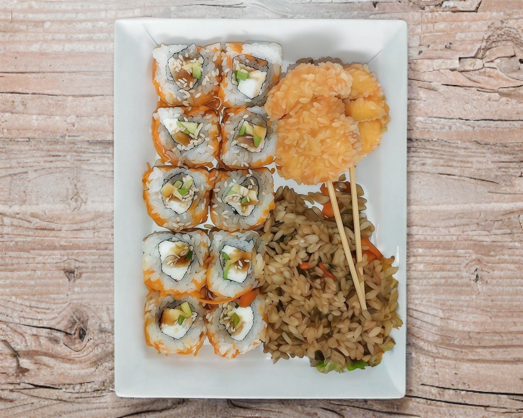Sake maki, barrio roll, philadelphia, california con camarón y brochetas de queso.