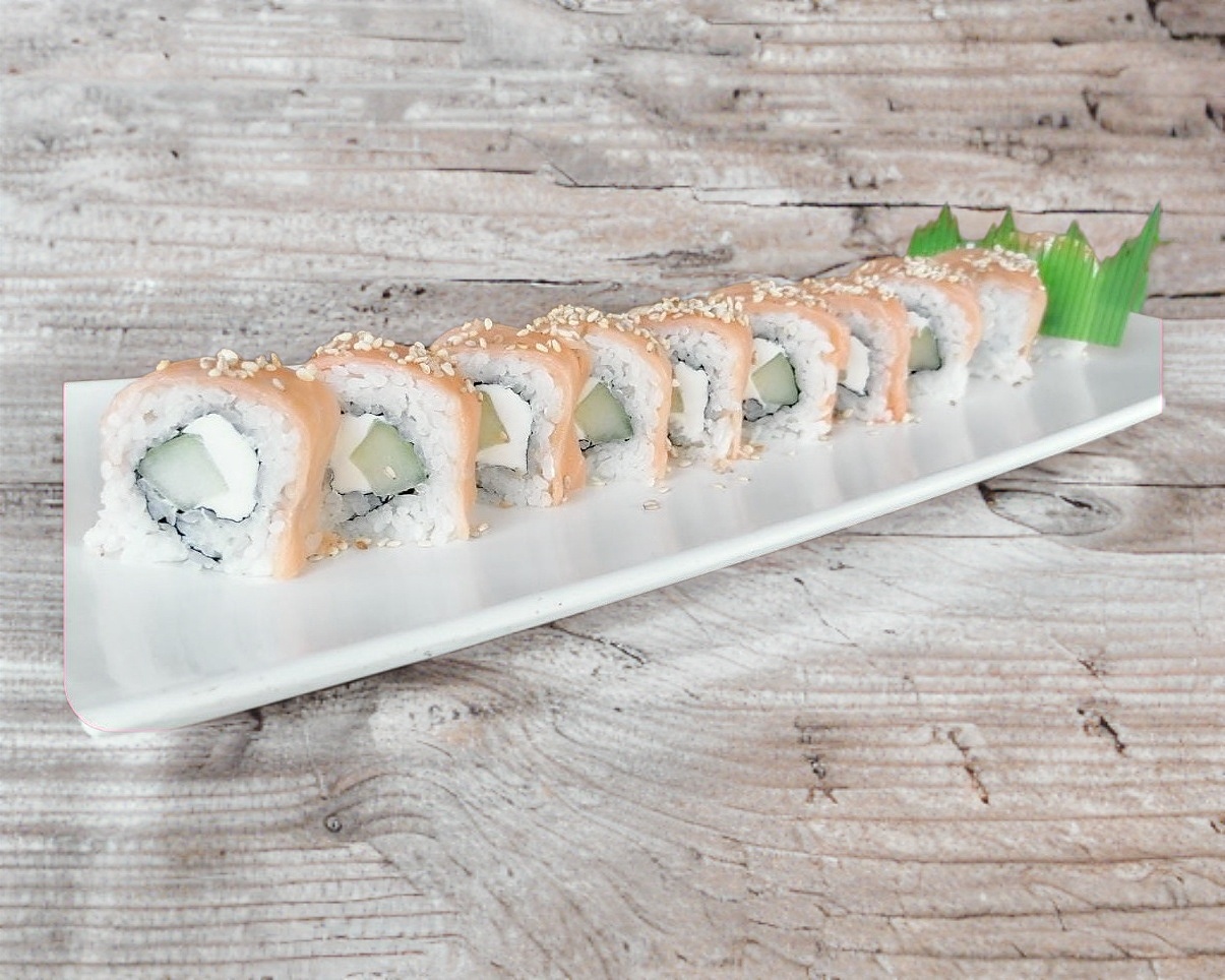 Salmon, queso crema, pepino, ajonjoli