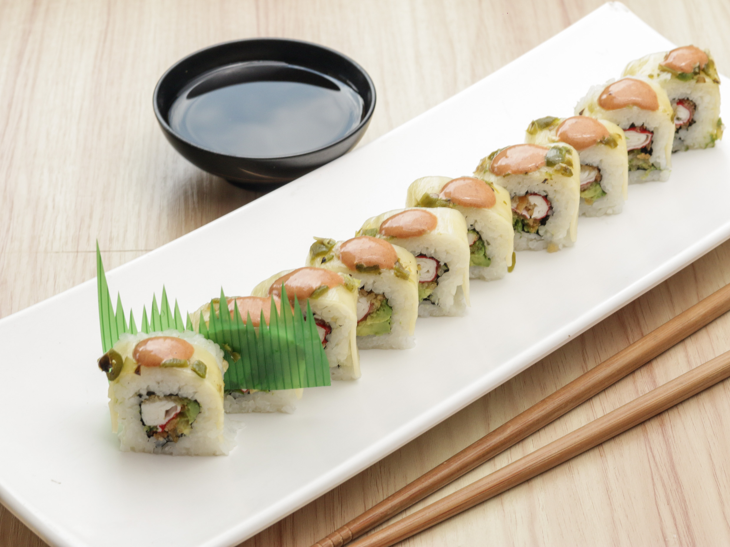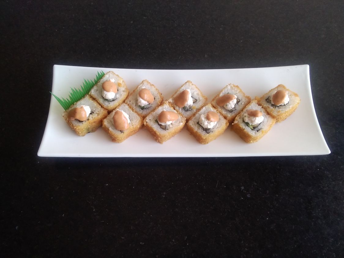 Aguacate, camaron empanizado queso crema, tampico, salsa kushiague