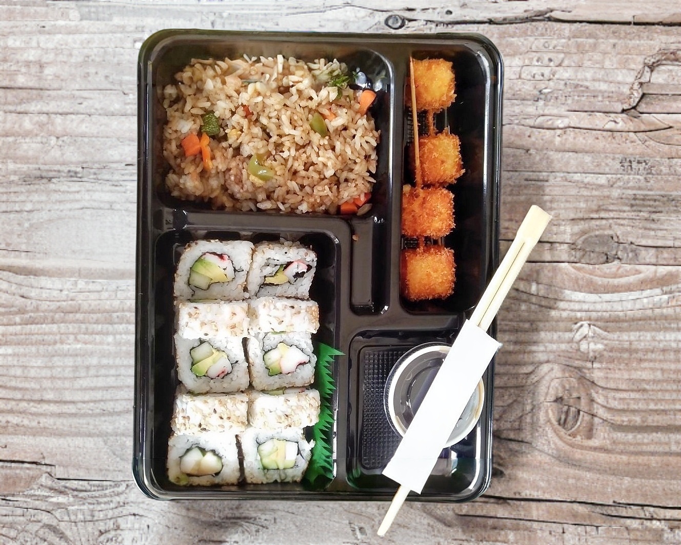 1 ROLLO CALIFORNIA DE CANGREJO + 2 KUSHIAGUES DE PLATANO + 1 YAKIMESHI DE VERDURAS (MEDIA PORCIÓN DE YAKIMESHI)