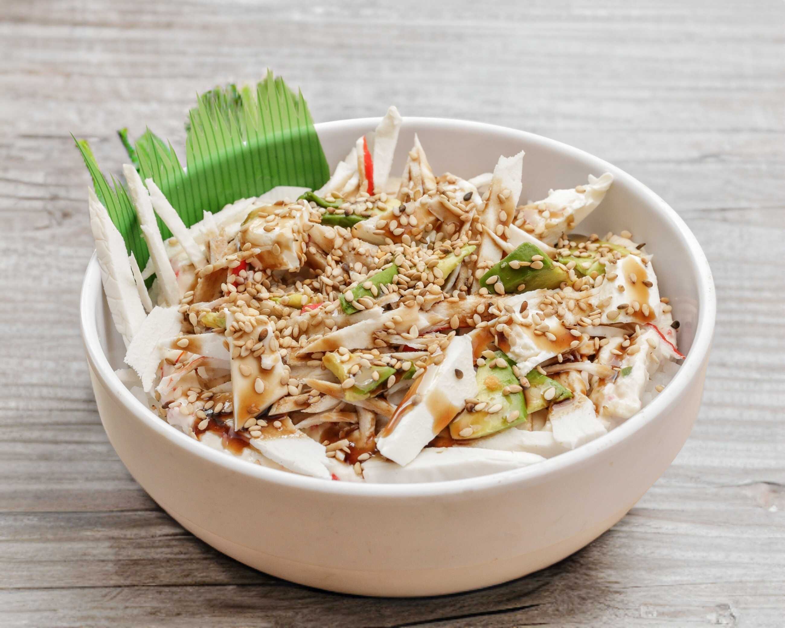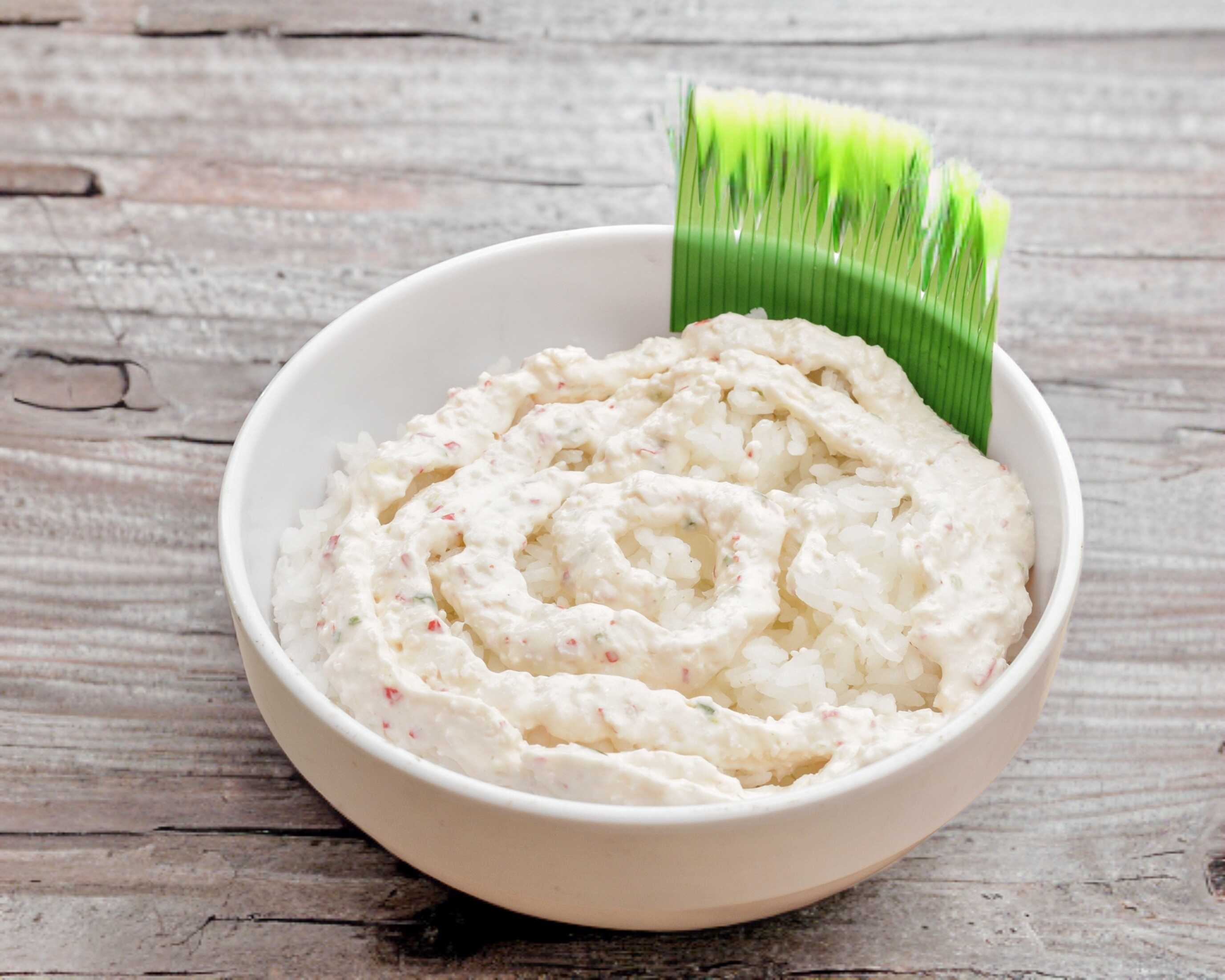 Arroz blanco al vapor con cangrejo, queso crema, salsa tampico, aguacate bañado en salsa dulce.