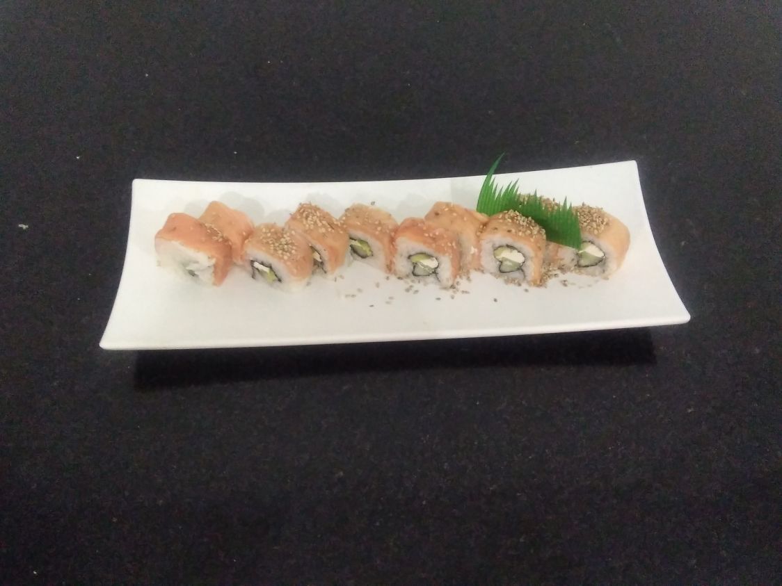 Salmon aguacate, queso crema, papino, salsa dulce, ajonjoli