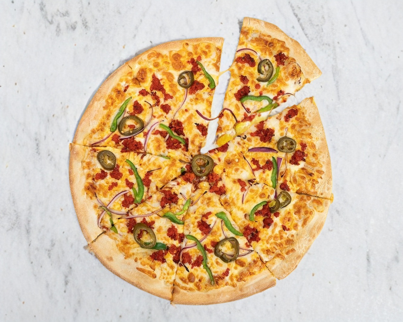 Pizza de chorizo, cebolla, pimiento verde y jalapeño con salsa de tomate y frijol. Tamaño big familiar de 40 cm.