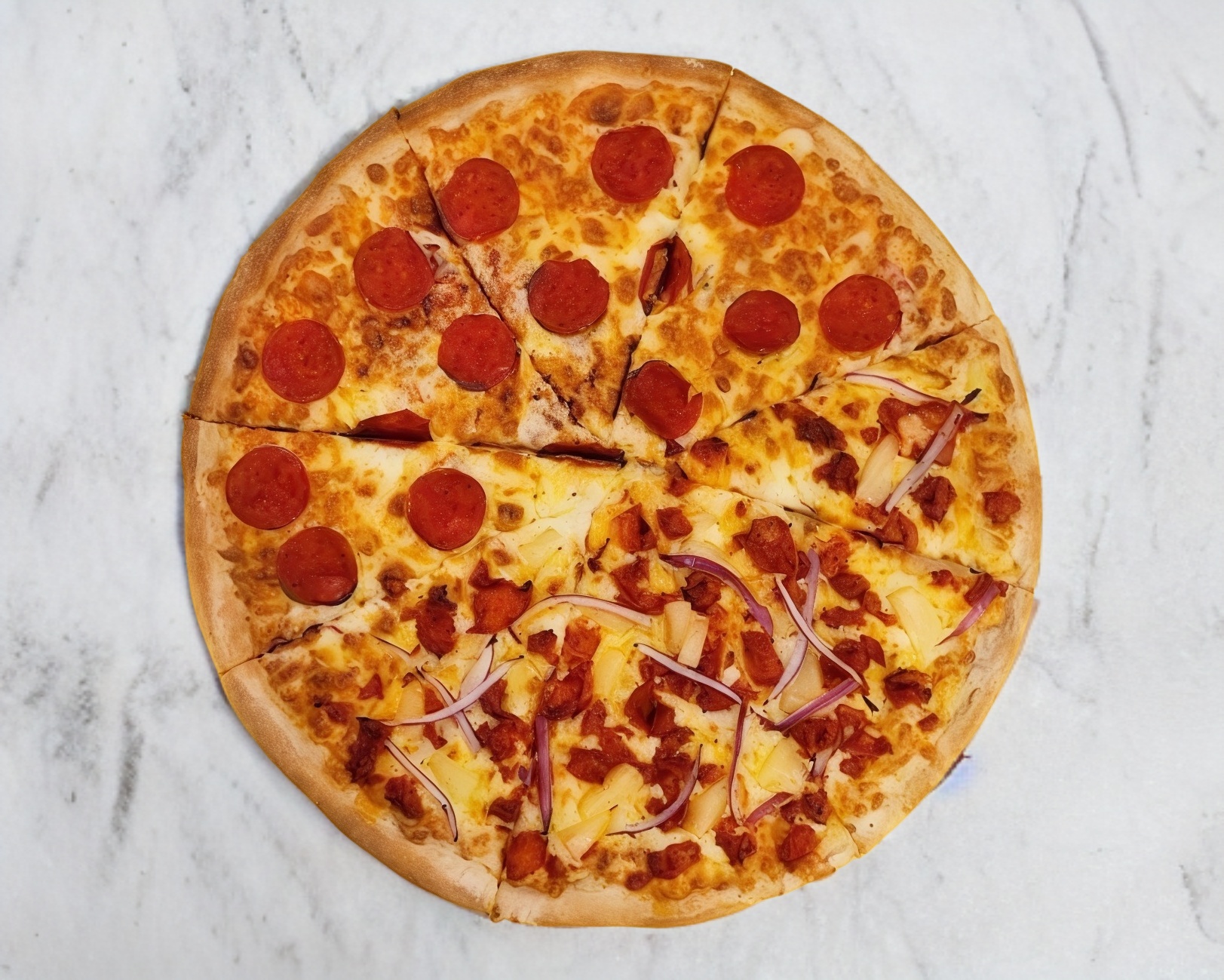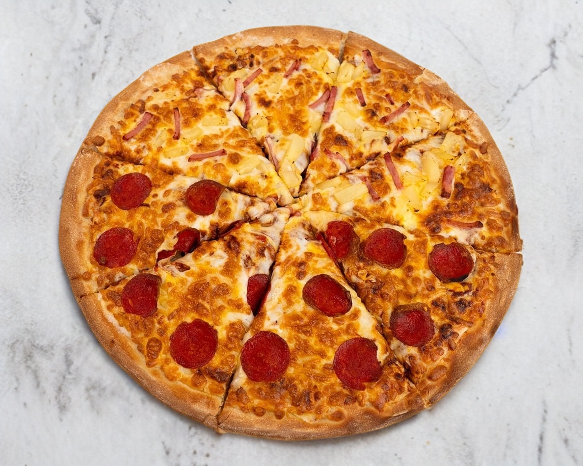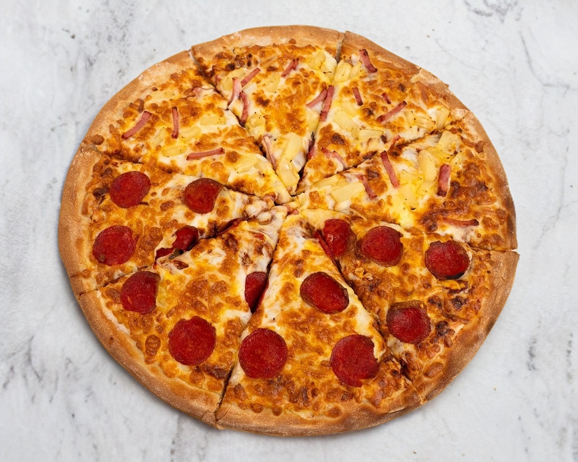 Pizza mitad pepperoni y mitad de jamón y piña tamaño big familiar de 40 cm.