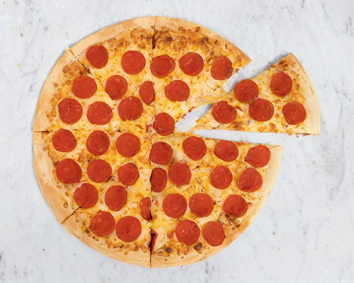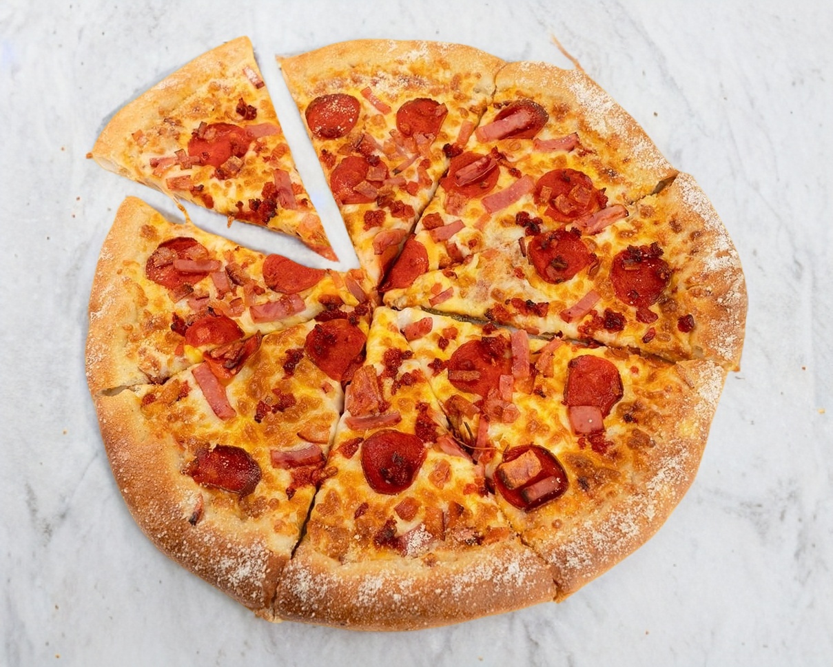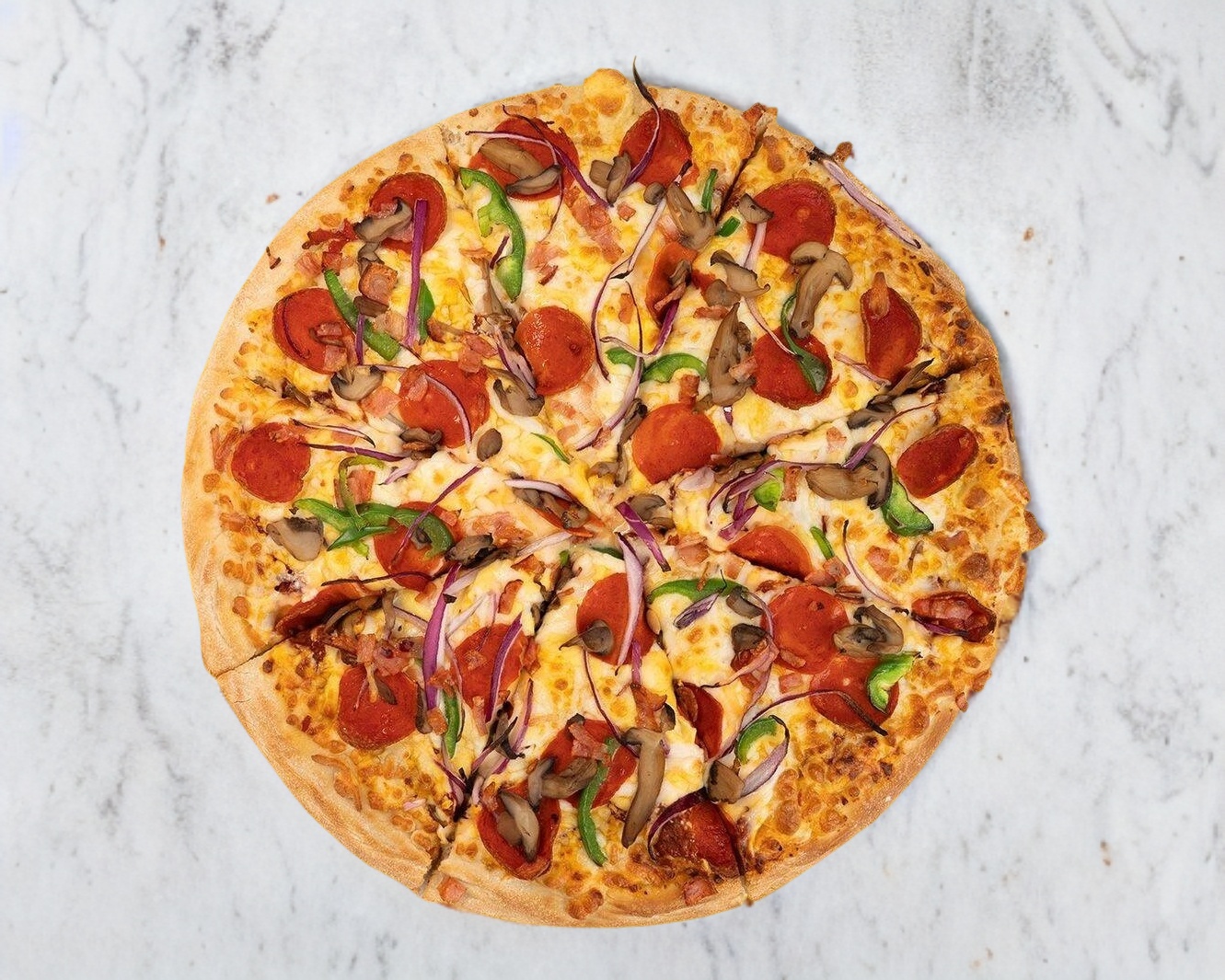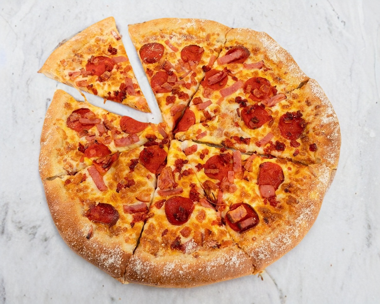 Pizza de pepperoni, jamón, tocino y chorizo, con especias italianas y orilla de queso.