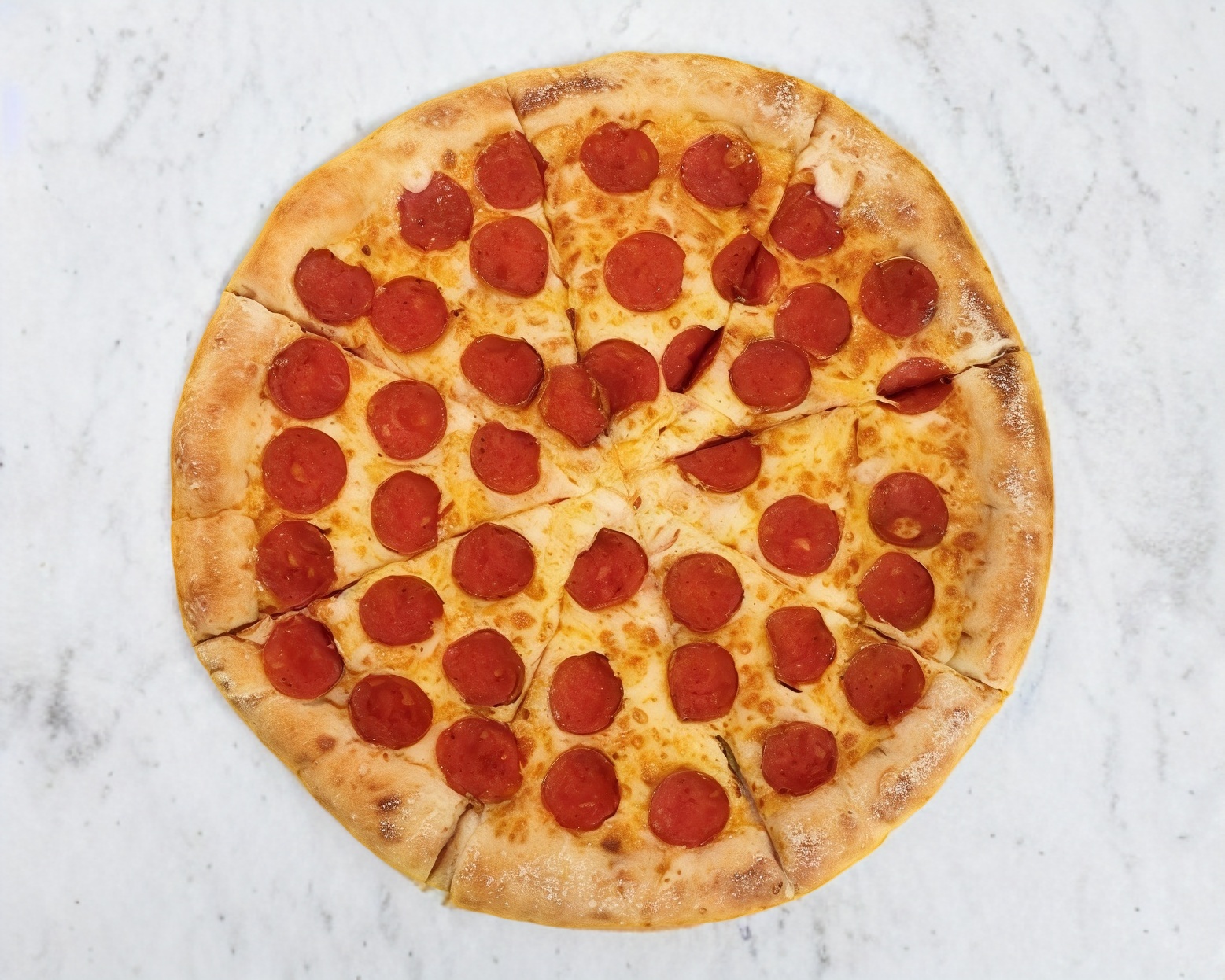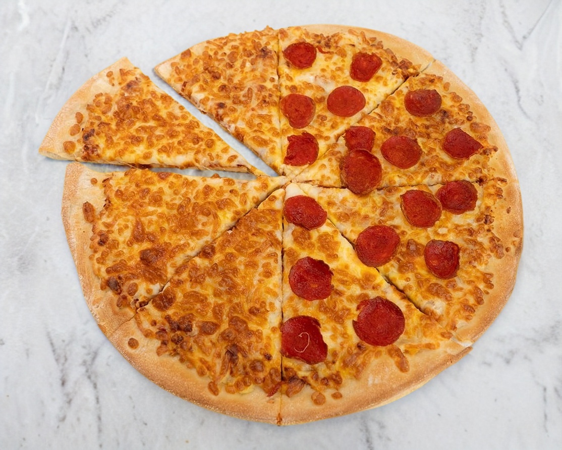 Mitad extra porción de queso y mitad extra porción de pepperoni. Tamaño familiar 40 cm.