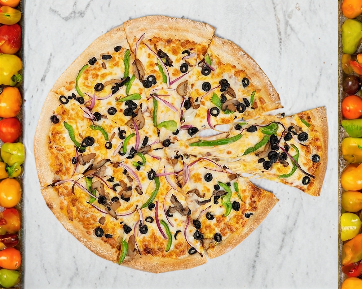 Pizza con champiñones, pimiento verde, cebolla, aceitunas negras y especias italianas.