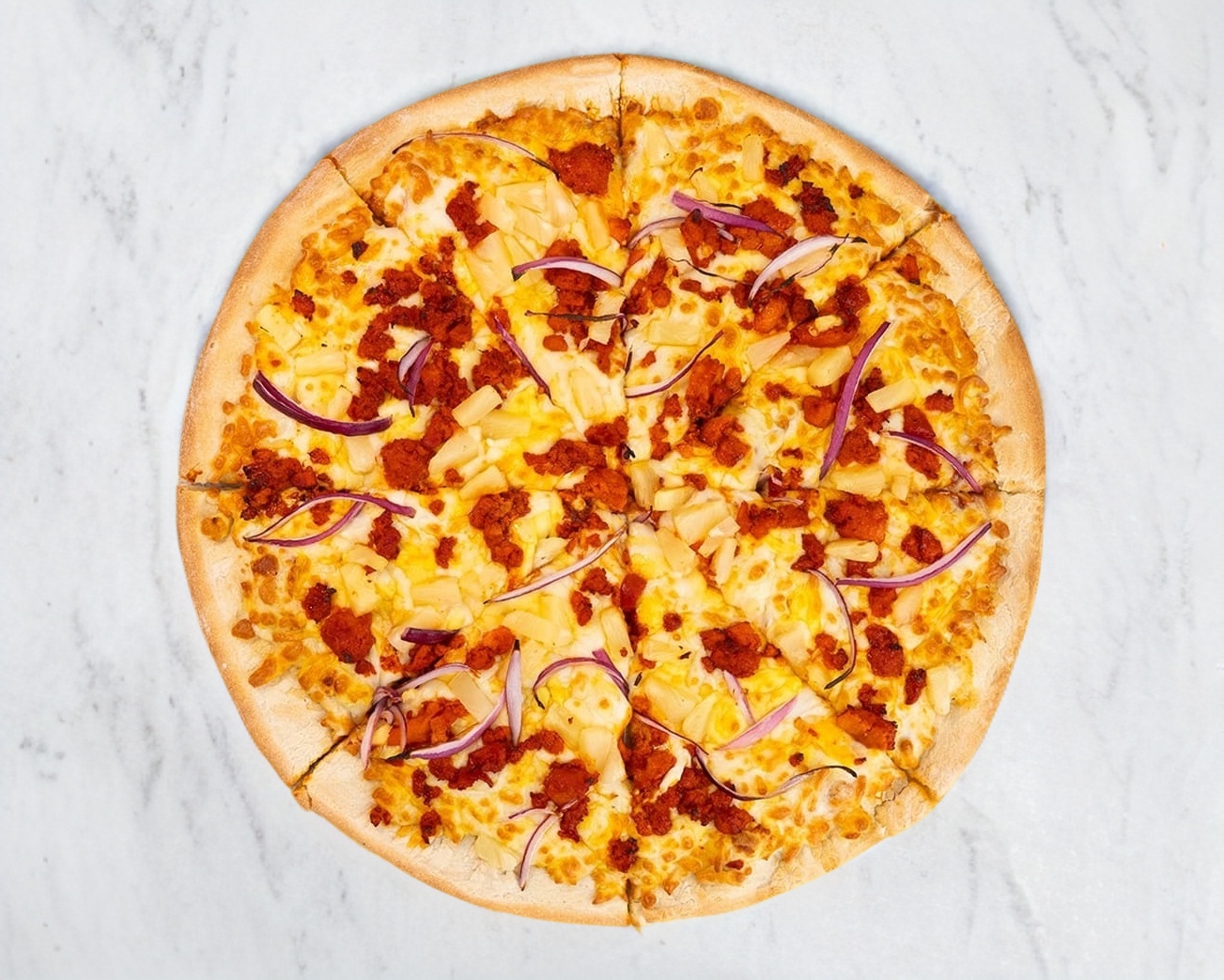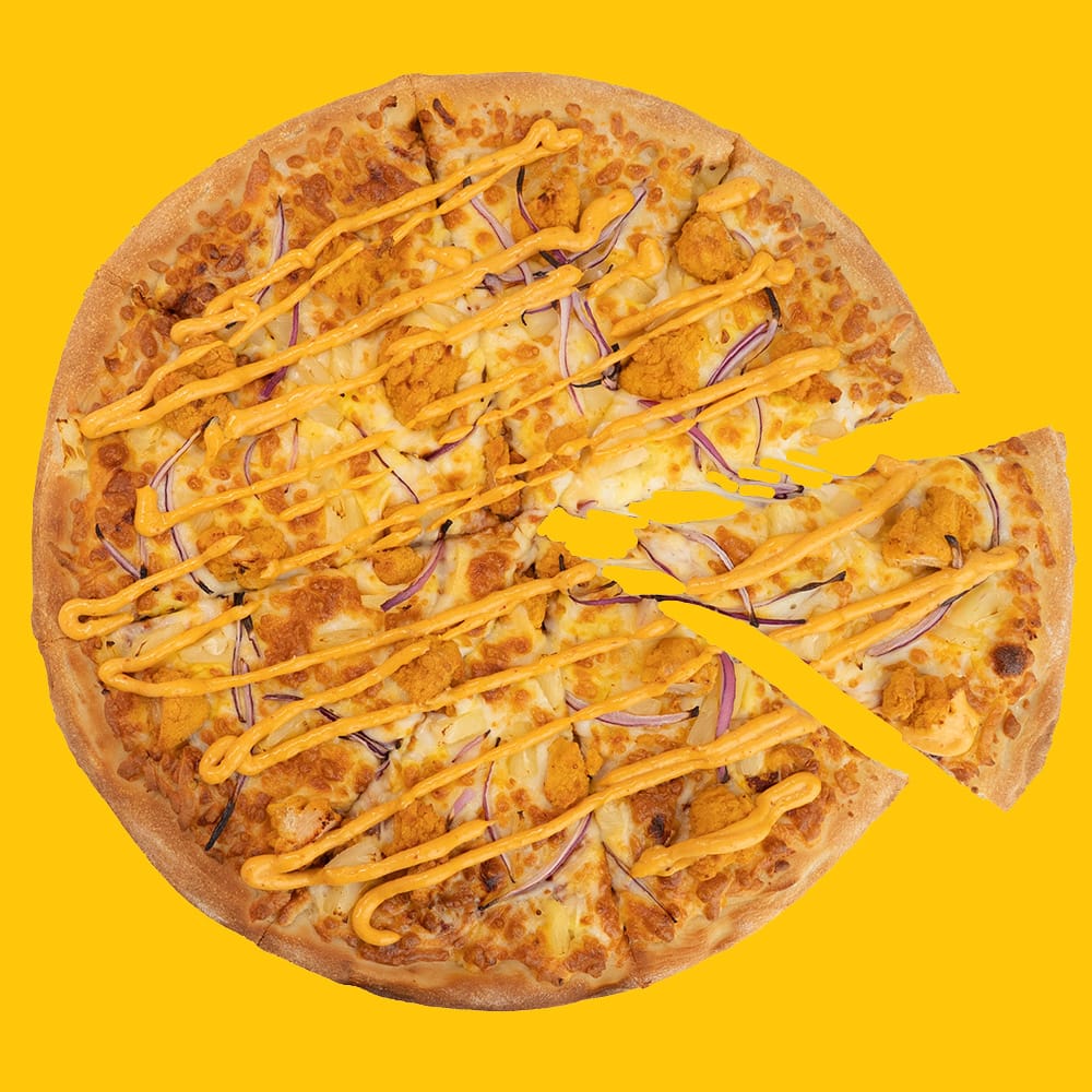 Pizza de boneless de pollo, piña, cebolla y aderezo chipotle.