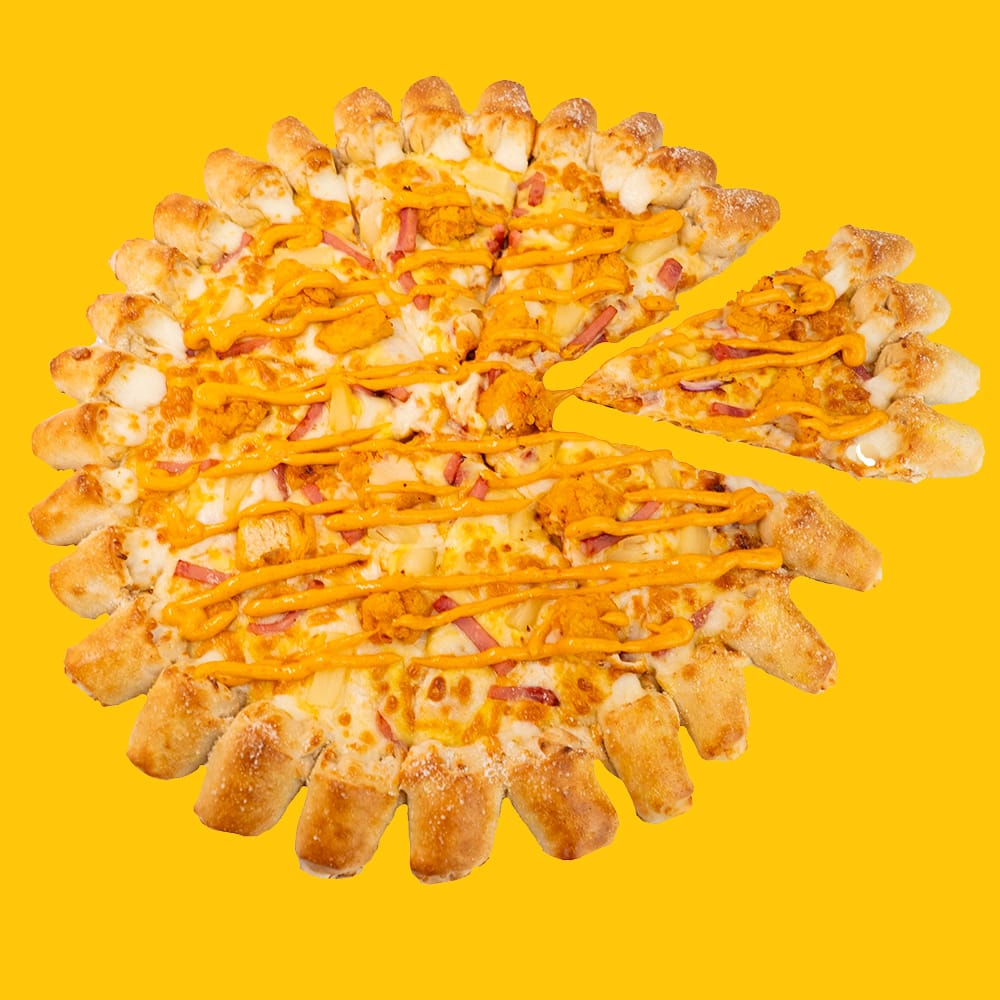 Pizza con base de salsa BBQ, con pollo, tocino, piña y orilla de dedos de queso mozzarella, barnizados con mantequilla de ajo y queso parmesano.