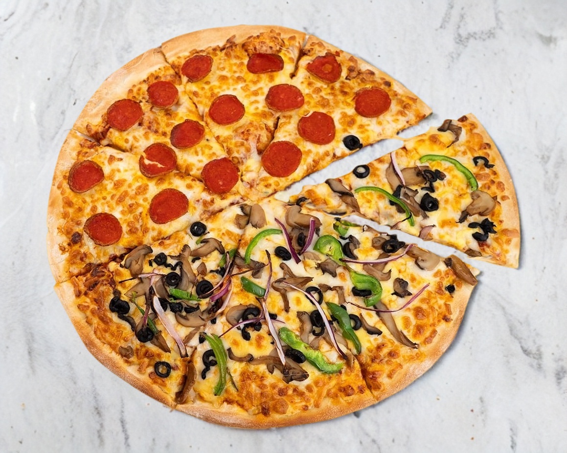 Pizza mitad pepperoni, mitad la especialidad de tu elección. 40 cm.