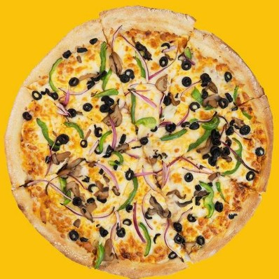 Pizza de pimiento, cebolla, champiñones, aceitunas negras y especies italianas. Tamaño big familiar.