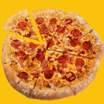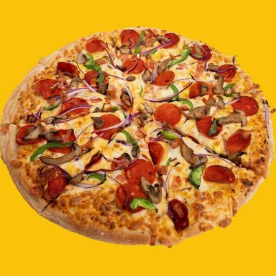 Pizza de pepperoni, jamón, tocino y chorizo, con especias italianas y orilla de queso.