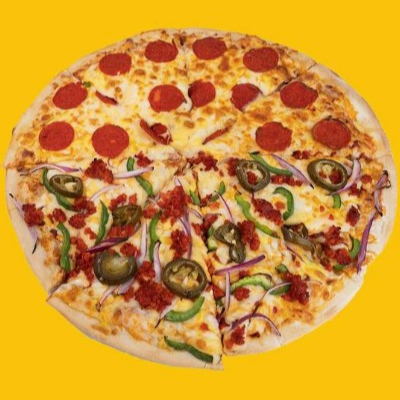 Pizza mitad pepperoni mitad pepperoni, jamón, tocino y chorizo, con especias italianas.(40cm)