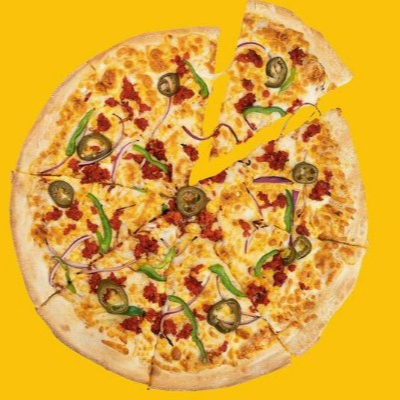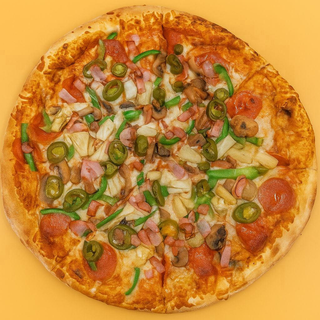 40 cm de Pizza con peperoni, champiñon, piña, pimiento verde, jalapeño y tocino.