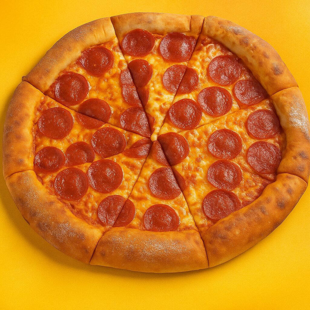 Pizza de pepperoni, jamón, chorizo, pimiento verde y cebolla.