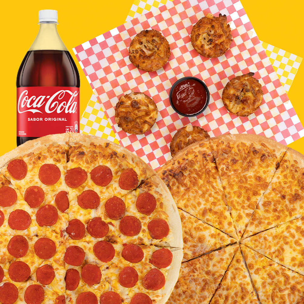 1 Pizza mitad extra queso, mitad extra pepperoni más 1 orden de bumblebee (orden de 5 panecillos rellenos de queso, jamón y piña, orden de 5 panecillos rellenos de queso y pepperoni) más refresco de 2 L.