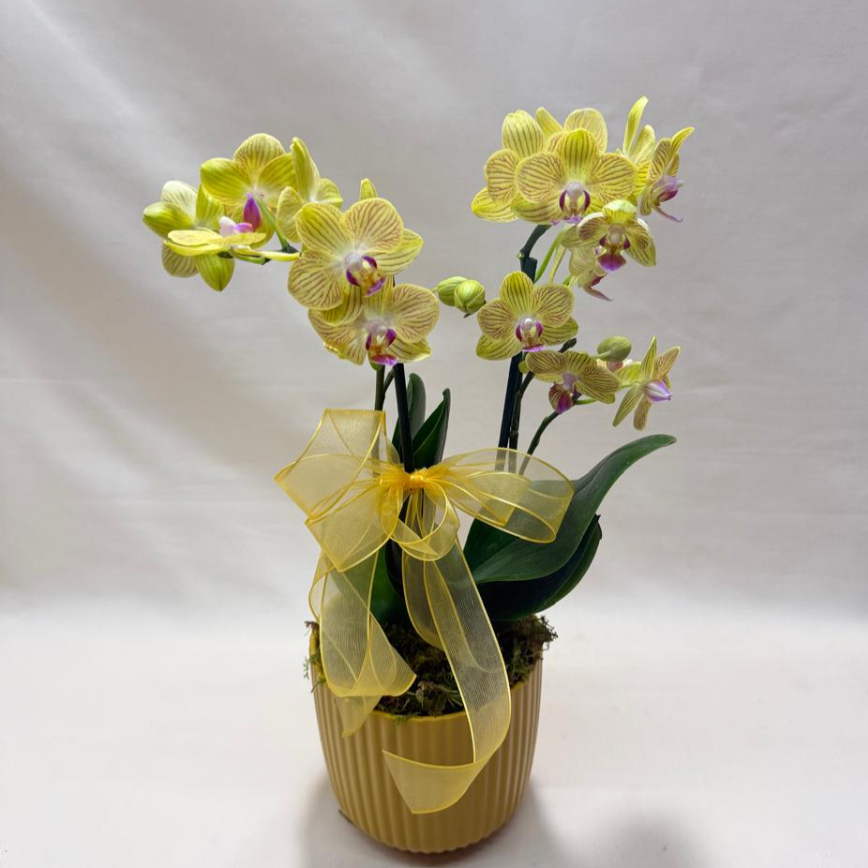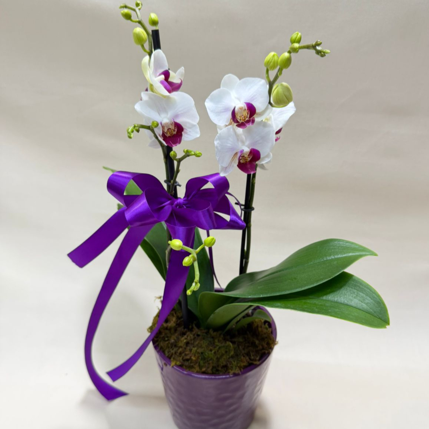 Maceta de cerámica con mini orquídea y moño, (las tonalidades pueden variar dependiendo la disponibilidad en tienda )
