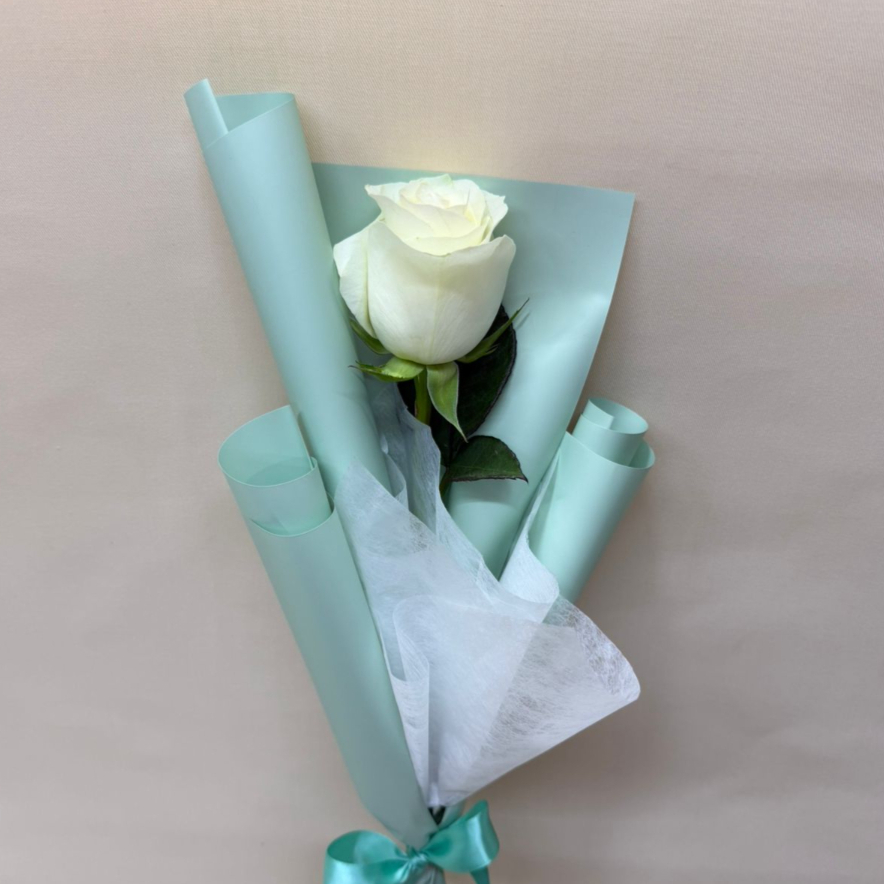 Rosa color blanca con papel, tubito de agua y moño.