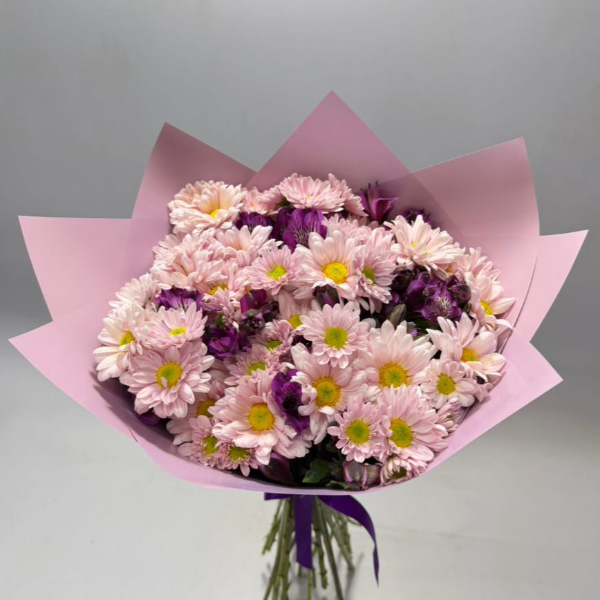 Ramo de astromelia morada, margaritas rosas (las tonalidades у follajes pueden variar según disponibilidad en tienda).