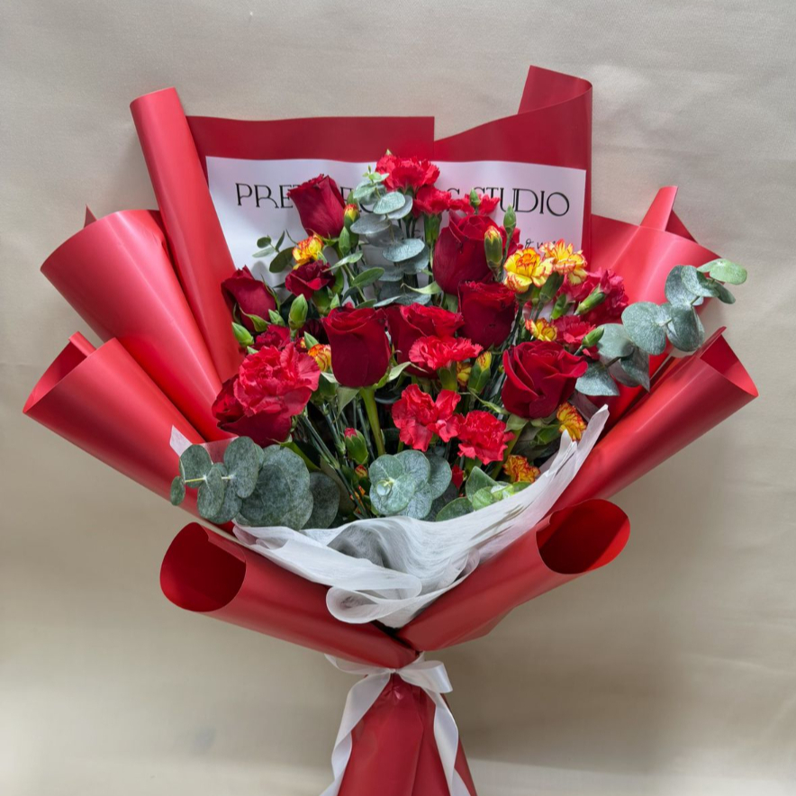 Bouquet de 8 rosas rojas, clavelina amarillos con naranja, clavelina roja acompañados de dolar como follaje, (las tonalidades y follajes pueden variar según disponibilidad en tienda).