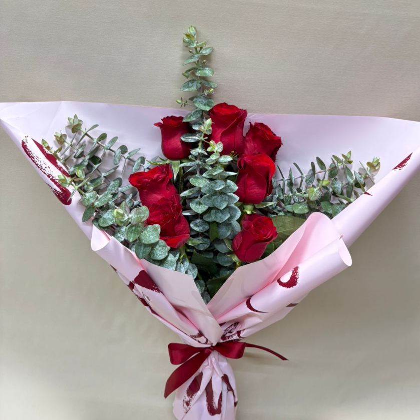Ramo de 7 rosas rojas acompañado de dolar como follaje (las tonalidades y follajes pueden variar según disponibilidad en tienda).