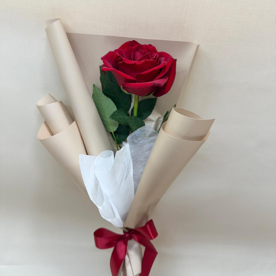 Rosa color roja con papel, tubito de agua y moño.