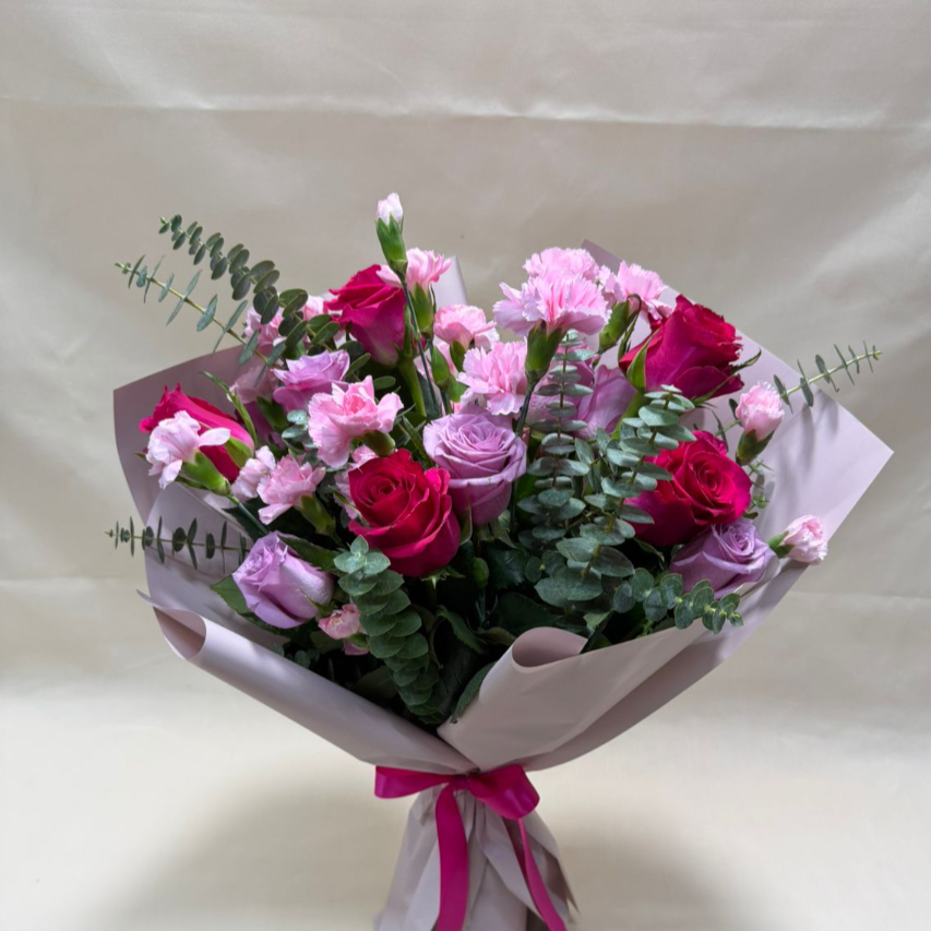 Ramo de 10 rosas, 5 fiucsa y 5 moradas, clavelina rosa, acompañado de dolar como follaje (las tonalidades y follajes pueden variar según disponibilidad en tienda).
