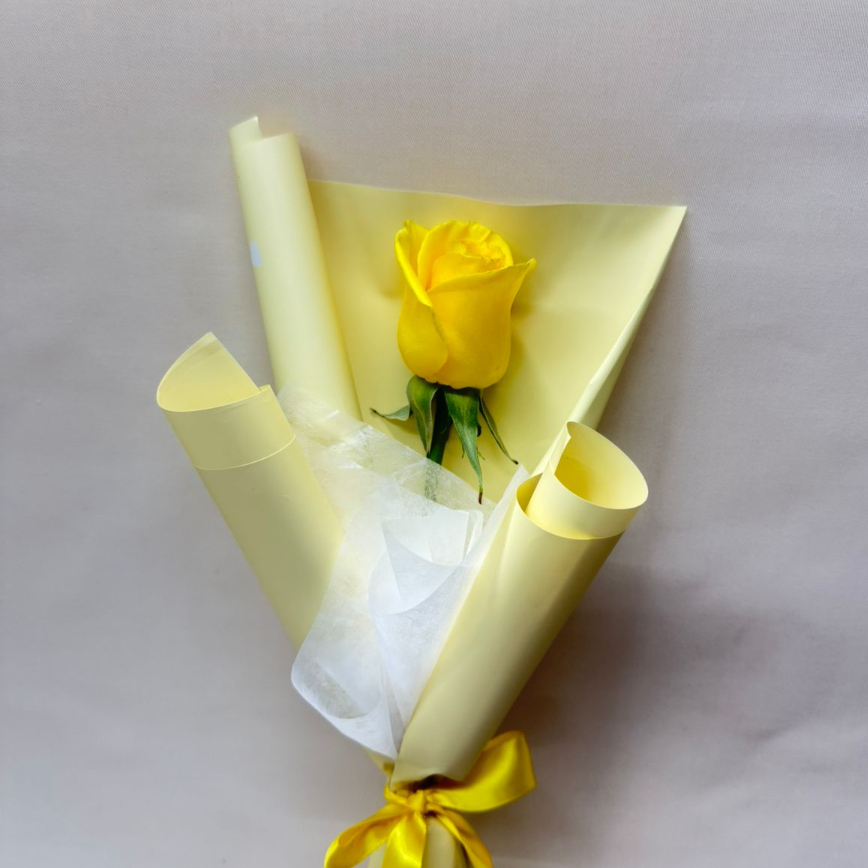 Rosa color amarilla con papel, tubito de agua y moño.