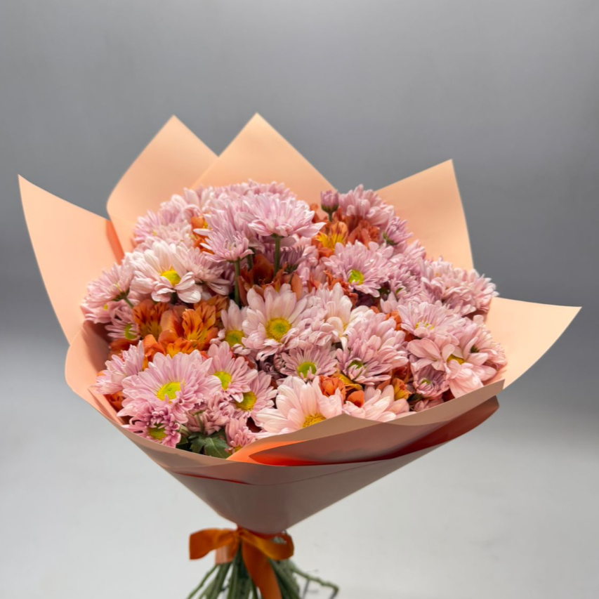 Ramo de astromelia naranja, margaritas rosas (las tonalidades у follajes pueden variar según disponibilidad en tienda).
