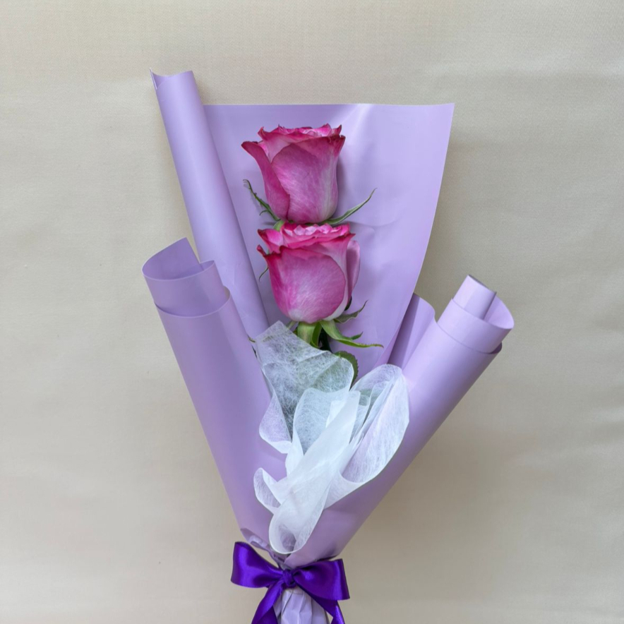 2 Rosa color moradas con papel, tubito de agua y moño.