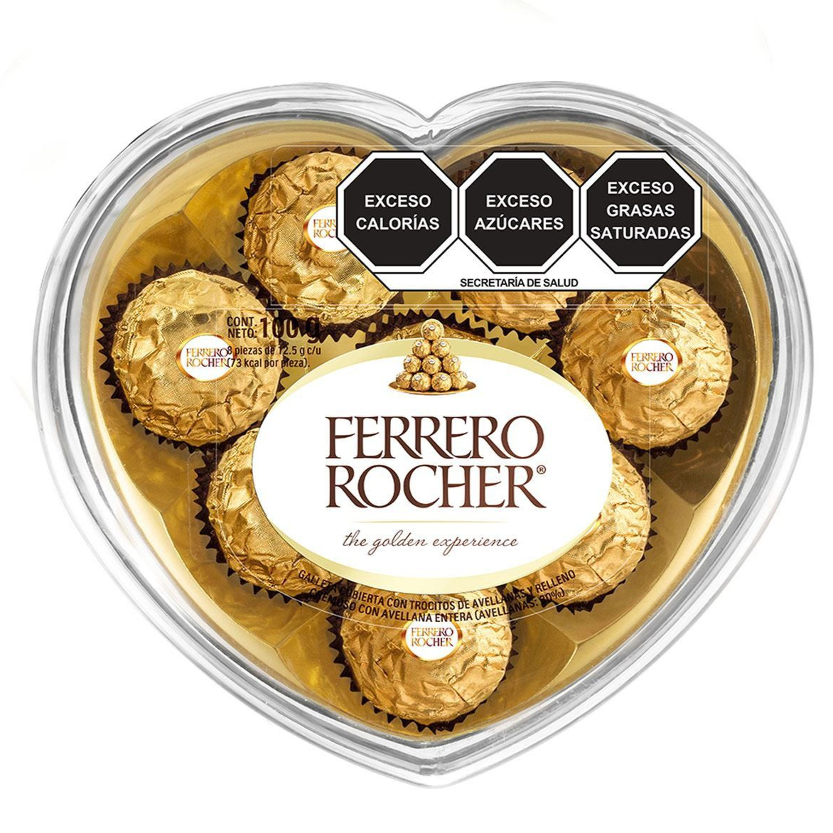 Ferrero Roche presentación en estuche con diseño de corazón, contiene ocho piezas preparadas con las avellanas enteras más finas, sumergidas en suave crema de chocolate y cubiertas de crujientes obleas con trocitos de avellana.