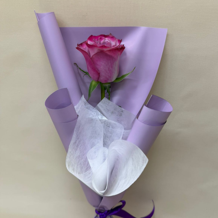Rosa color morada con papel, tubito de agua y moño.